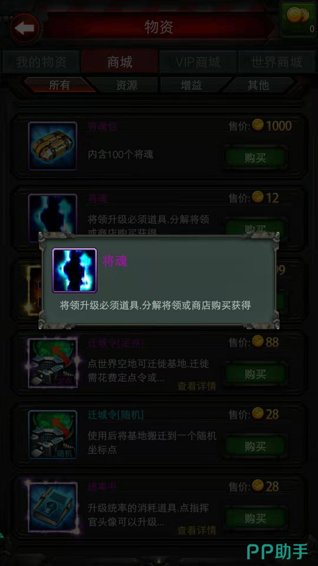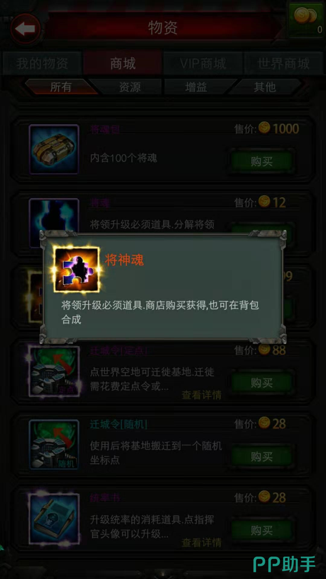 在商城中一个将魂包含100个将魂,需要花费1000枚金币。