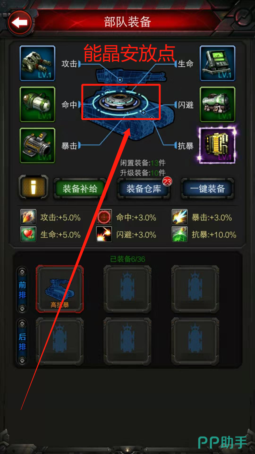 进入装备页面以后,可以看到战车的几个指标:攻击,生命,命中,闪避,暴击,抗暴,这些指标通过使用不同的装备,可以得到大幅度的提升,而将这些指标合成到一起的,就是能晶。