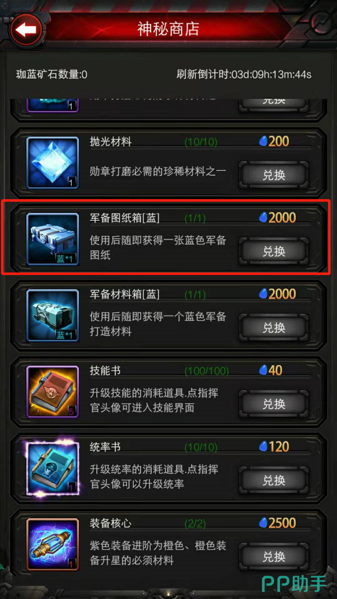 在挑战界面的下方可以看到有一个神秘商店的按钮,点击进入神秘商店。在神秘商店中有一件商品叫做军备图纸箱【蓝】,使用2000枚珈蓝矿石即可换取一份蓝色军备图纸,进入工厂即可加工。
