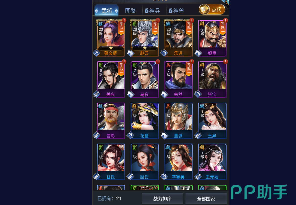 而在武将的划分中除了魏蜀吴还有一个群雄的势力,这四个势力的武将本质上没有什么区别都是可以使用的,只是当我们上阵的时候可以考虑使用不同的武将来组合不同的军师技能。具体的军师技能大家可以在游戏中的点兵界面中查看,小编在这里就不给大家一一赘述了。