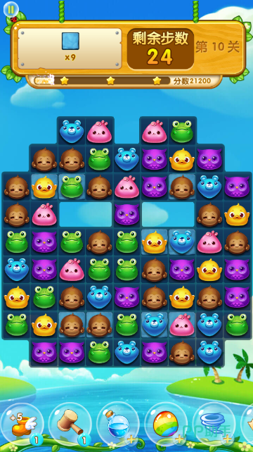 关卡中主要是在特定的步数里消灭特定数量的动物或者冰块,完成该要求就可以通关。剩余步数越多获得的分数也就越多,尽可能用最少的步数过关。