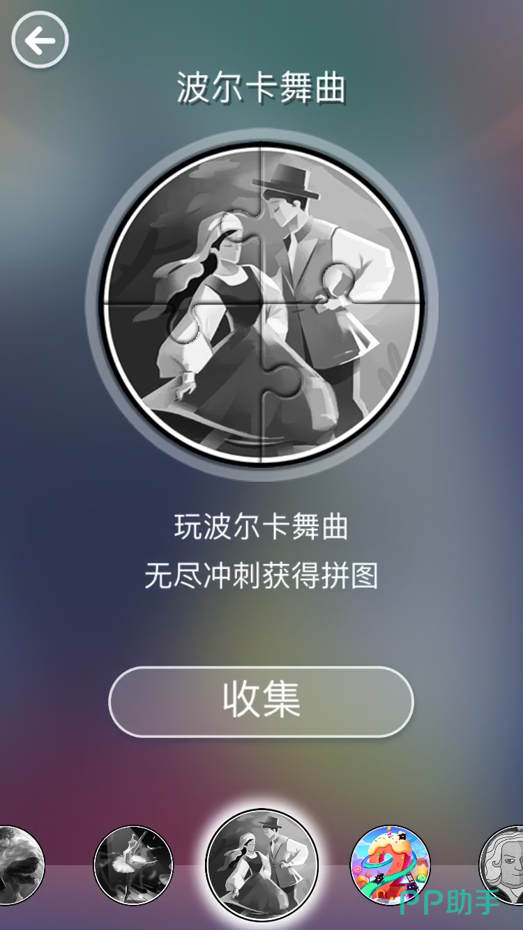 3、随后向左滑动或向右滑动,将会出现以下画面,出现灰暗色的主题画面表示我们无法选择该主题作为游戏背景,只有当我们收集四块相同主题的音乐碎片后,该主题才能被我们选择应用为背景。
