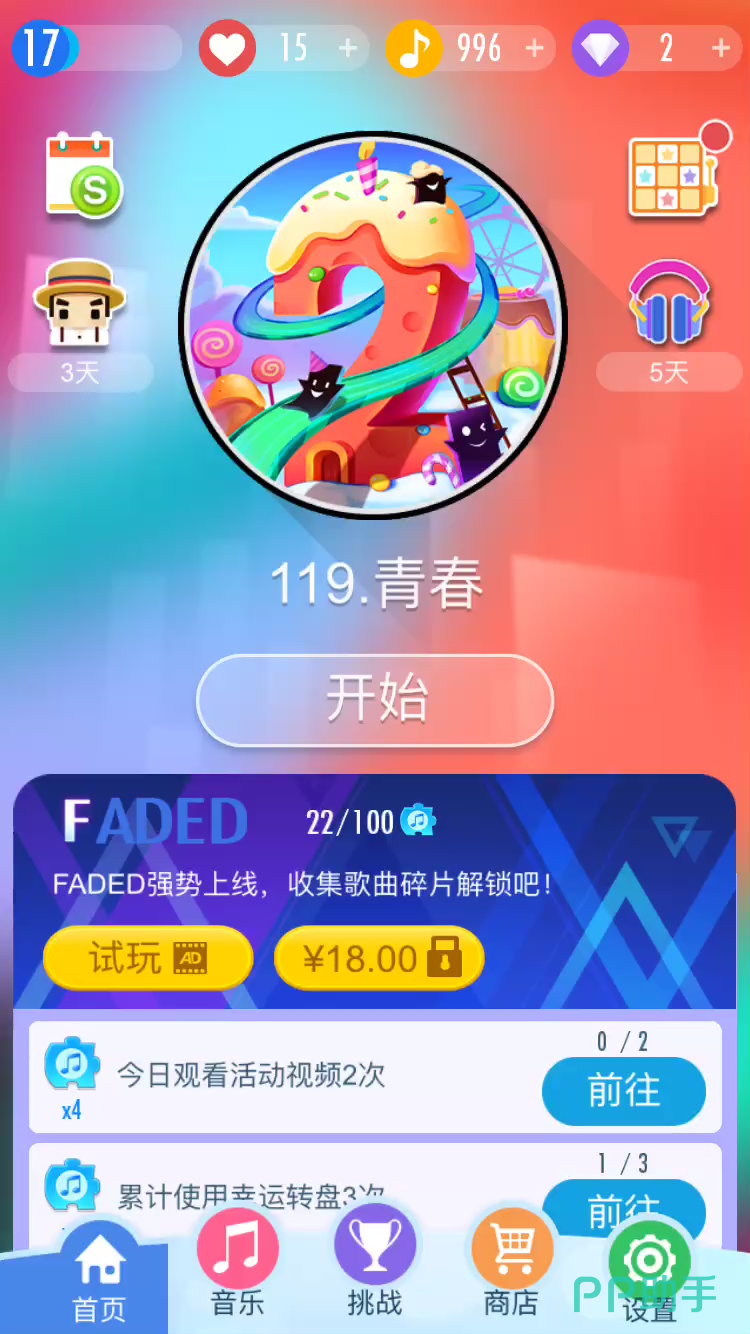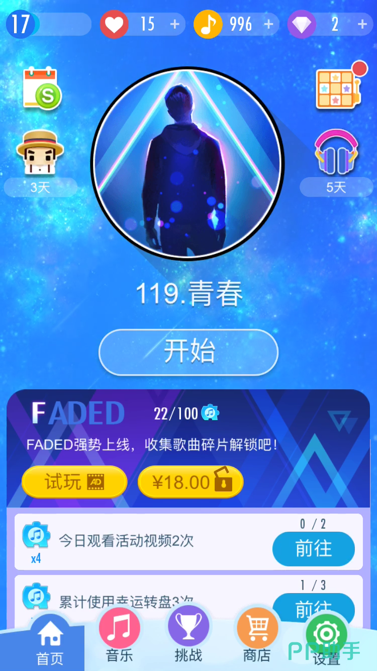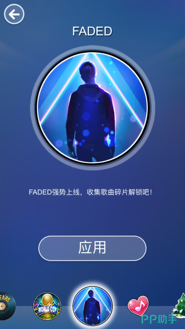 2、点击下方图中圆圈处,即青春二字上方的圆圈,这是faded歌曲碎片。faded是这款游戏与Alan Walker的音乐碎片专辑主题,需要付费购买。