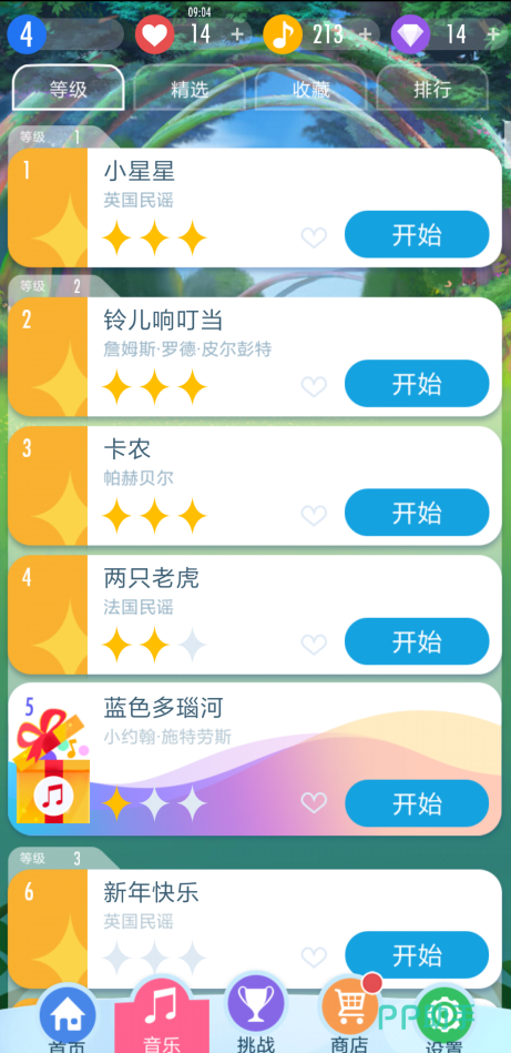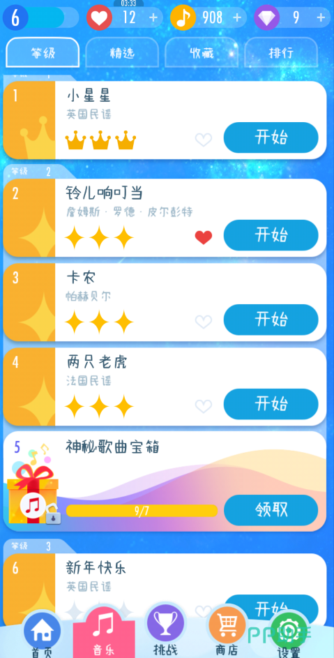 1.玩家第一次进入游戏时,就可以直接免费获得一首歌曲《小星星》,来给玩家热热身。