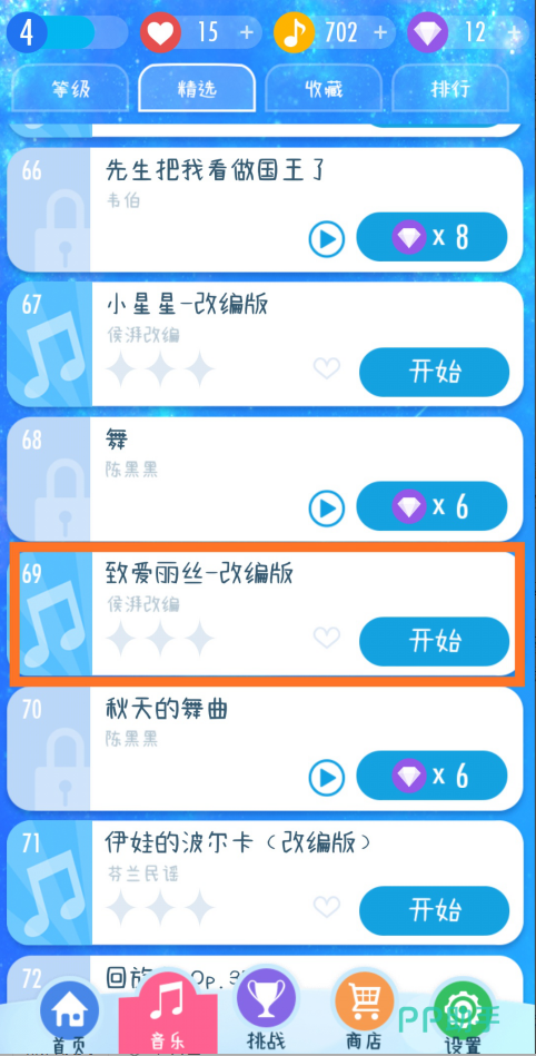 1.首先我们打开游戏,点击下方的“音乐”一栏,然后点击上方“精选”,在这个界面中,我们可以看到有许多广受欢迎的背景音乐。这些音乐有的是免费的,有的需要花费六到八个钻石来购买。不断往下滑,我们就可以找到这首《致爱丽丝》的替代品——《致爱丽丝改编版》。他虽然没有原版那样惊险刺激,但是玩起来还是比较有趣的,比较适合新手玩家。