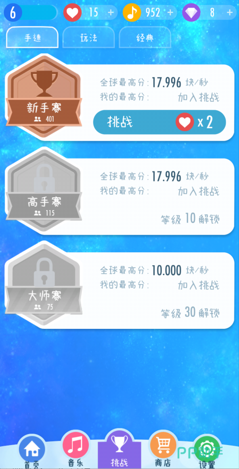 1.锻炼手速:手速可以说是玩好钢琴块二2的关键。我们可以通过点击下方“挑战”,在“手速”界面进行锻炼!它包括新手赛,高手赛和大师赛。锻炼手速是需要时间和耐心的,小伙伴们不要急于求成,慢慢来。
