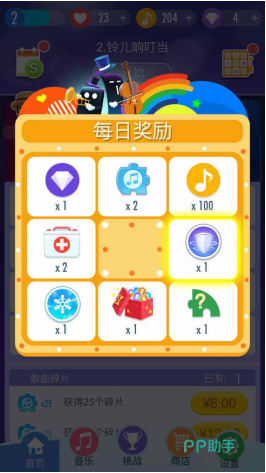 1、大家可以在音乐一栏中,挑战任意的曲子。在挑战中有几率会出现礼包,大家千万别错过它了,曲子结束后我们可以打开它,大家有机会在里面获得碎片。