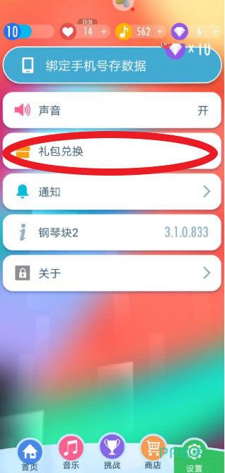 4.接下来我们点击下方的“设置”,在这一栏中我们可以对游戏的声音,通知提醒进行开关处理,也可以进行礼包兑换,除此之外,新手玩家还可以绑定手机号存数据,以及关注公众号可以获得免费的钻石呢!
