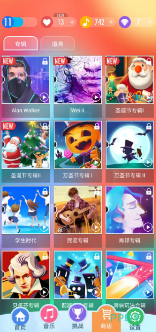 在商店,可以进入专辑、道具和砖石三个小分布。如果有需要,可以通过充值或者消耗已有的资源来换取道具。
