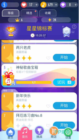 3.当然,可能这首改编版的歌曲,无法满足所有玩家的需求。对于一些老手玩家来说,这首歌曲有些过于简单了。既然在目录里找不到原版,我们有时候也可以靠自己的运气。在 音乐—等级 的游戏界面中,除了可以通过升级的方法来获得歌曲外,还可以打开神秘歌曲宝箱,来获得额外的歌曲。
