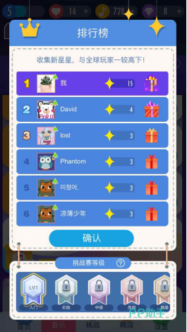 最后就是最重要的,排行榜。在排行榜模式中,只要你收集足够多的星星,能够上榜,那么你每天都能开宝箱了。