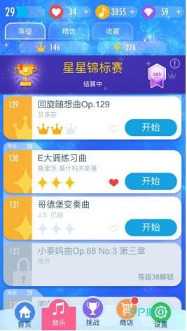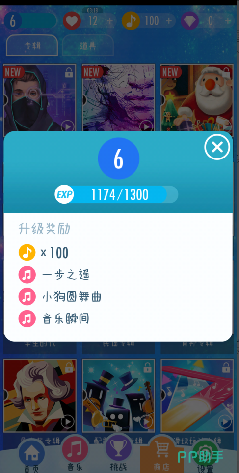 2.完成热身之后,我们点击下方的“音乐”界面,就可以看到许多背景音乐可供我们选择。玩家在游戏过程中会积累经验值,达到一定经验值就会升级,每提高一个等级,会获得许多奖励包括歌曲,钻石,金币等。