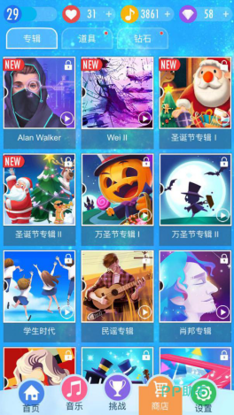 3.当玩家想要更多的歌曲,或者需要购买道具时,点击下方的“商店”,就可以购买自己喜欢的歌曲啦!大部分歌曲用钻石就可以购买。但是道具是需要氪金购买的,不过我们也可以在平常的游戏中免费获得道具,例如做任务,升级等,当然如果你是土豪就不用在意啦!