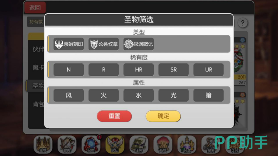 圣物分为三种类型:公会文章、原始刻印、深渊徽记。(1)原始刻印:挑战委托副本或收集魔卡的方式获取。(2)公会文章:通过委托副本收集魔卡来获得,每个属性都有相对应的公会文章。(3)深渊徽记:参与邪灵之战或其他游戏的活动中获取。