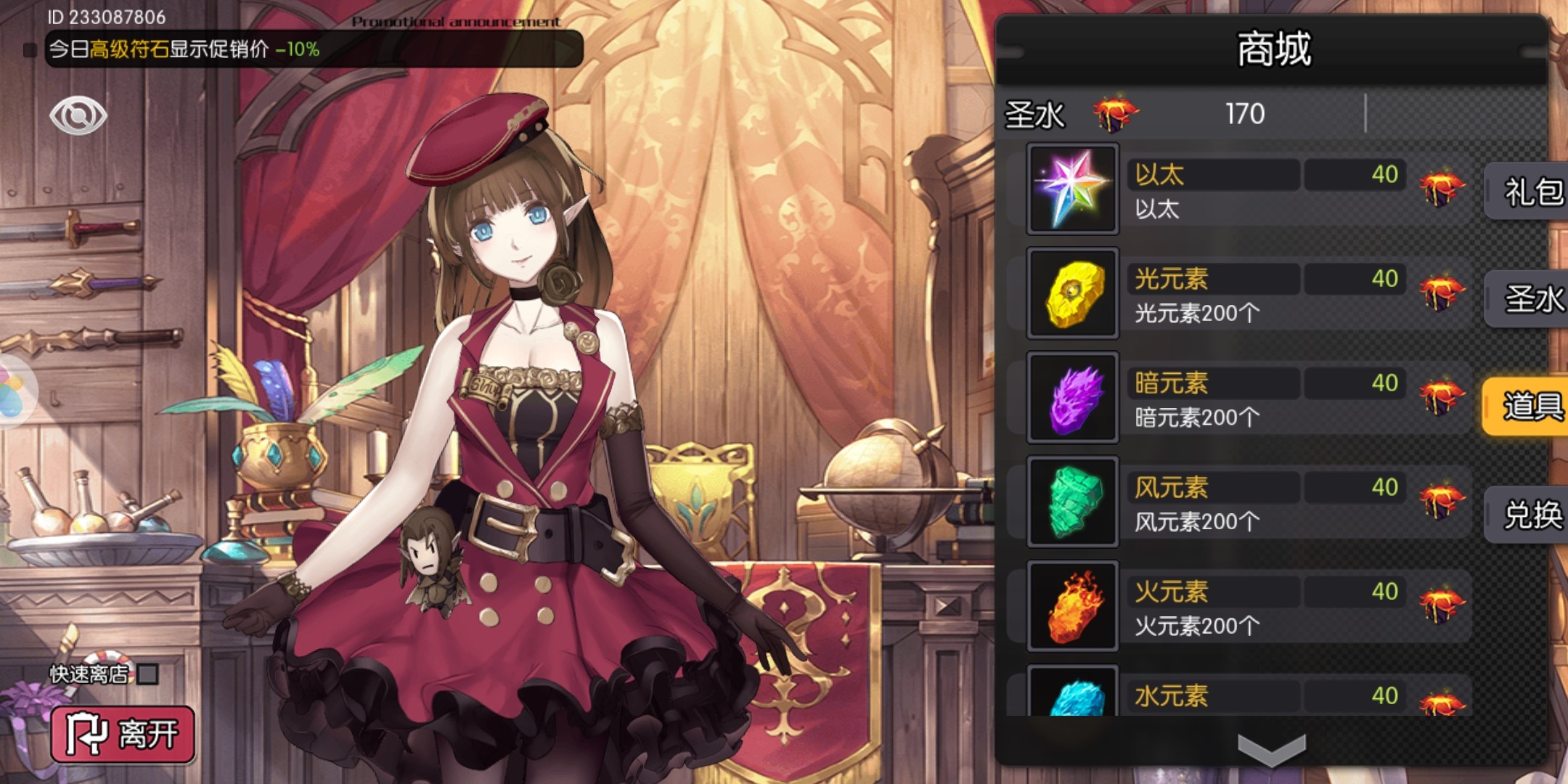 在这里看向右边的标志,元素就包含于道具之中,如下图所示。既然是商店,就要有足够的圣水去买这些东西,都是要花费的。