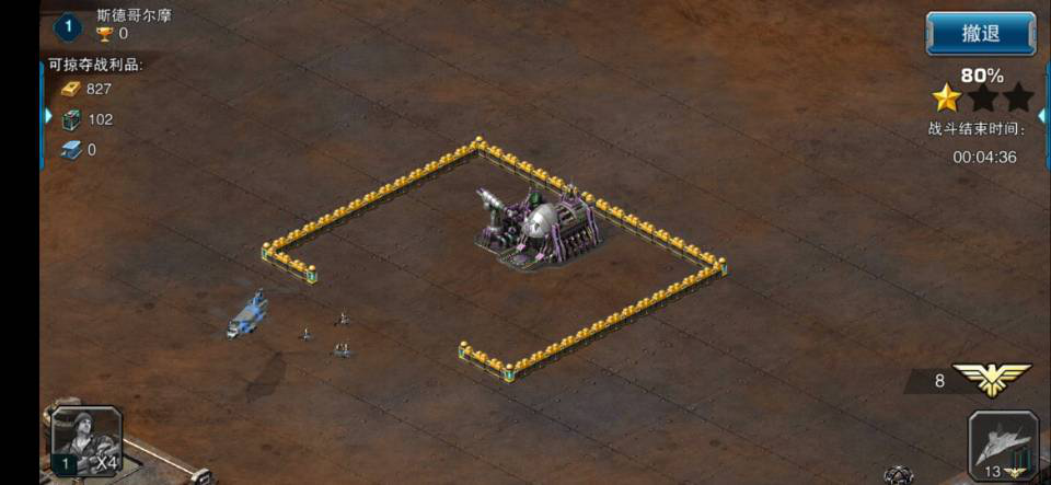 点击侦查,可以看到敌方的基地,如图1,其中点击建筑物可以看到建筑物的相关信息,如图中的研究院,可以看到级别和血量,但是在侦查中看不到哨戒炮的具体信息。