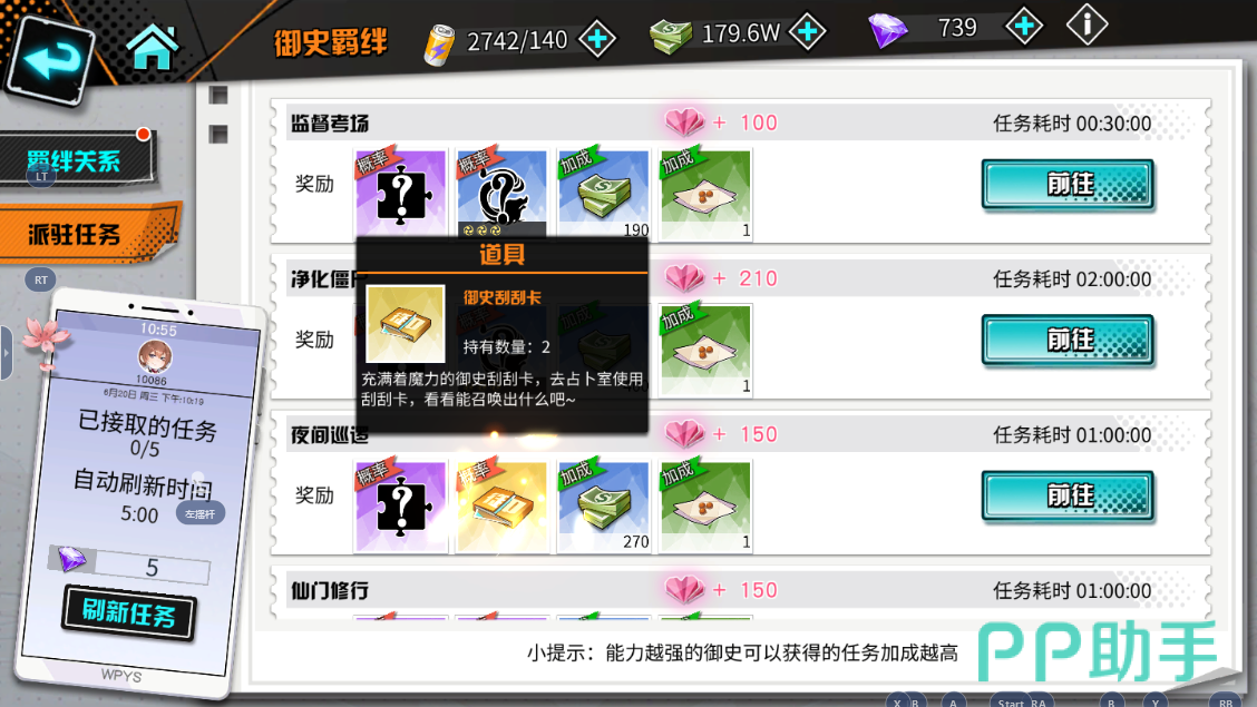 (3)羁绊任务:完成羁绊任务有几率获得刮刮卡,御史羁绊加成越高获取几率越大,想要获得刮刮卡的玩家,尽量多准备御史。
