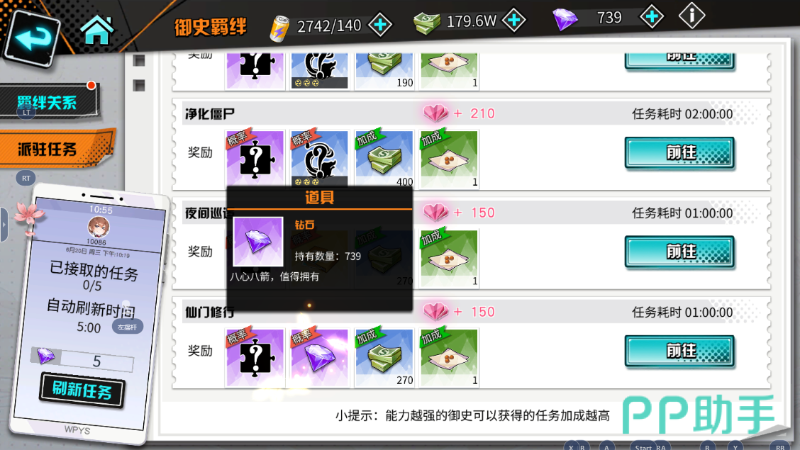 (5)获取钻石:钻石是王牌御史手游中作用最大的物资,买体力、买刮刮卡、买神兽都需要钻石。大家可以通过完成每日任务来获得钻石,羁绊任务也有几率获得钻石。