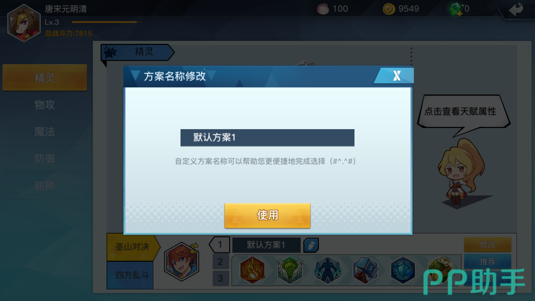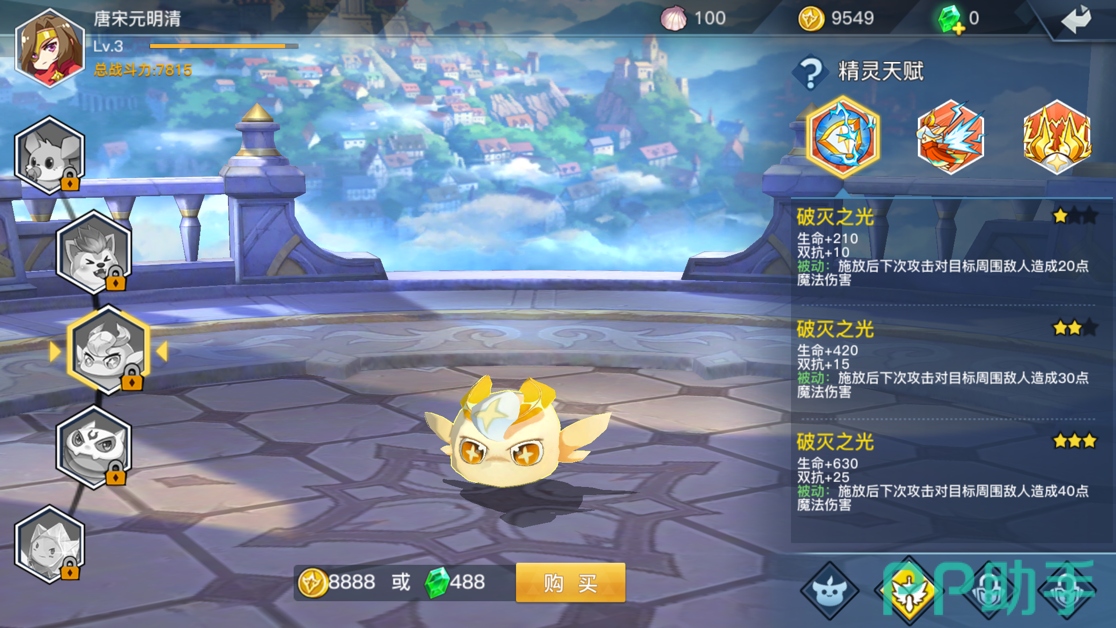 而精灵天赋就需要根据玩家所选择的精灵进行设置了,每一位精灵都有着3种天赋进行选择,基本对应着3大效果:攻击类,物理防御类,魔法防御类。