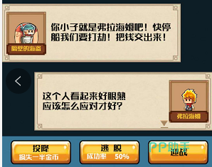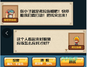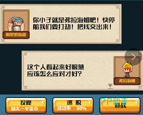 【海盗】是在绯红之海里面避免不掉的事情,无论什么时候,总会有突然而至的海盗如果玩家实力不济,并且逃跑不掉,那么要么支付自己现在拥有的一半的金币,破财消灾,要么就是硬上,通过船只的耗损和水手的耗损。来降低敌人对自己金币的掠夺。