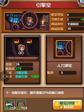 船只的【引擎室】每升一级都会直接给整个船额外的航速加成,这个时游戏中与【航海技能】一样能够明显提升航速的办法。【引擎室】的等级与船只的等级有关,而船只的升级需要大量的材料和金币,同时在各个港口的【学院】学习【航海术】技能,也需要耗费大量的金币。所以想要提升航速,玩家还得有充足的物质基础。