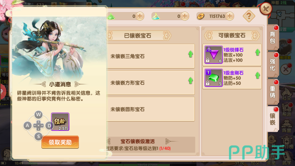 首先点击背包在界面中找到镶嵌,在镶嵌的界面中玩家可以看到每个装备都有不同的镶嵌孔。在武器输出类的装备上有两个三角宝石和一个圆形宝石,三角宝石玩家必须要选择增加双攻的宝石来提升凤鸣的输出能力,圆形宝石需要选择暴击率的宝石来提升在战斗中的伤害爆发能力。