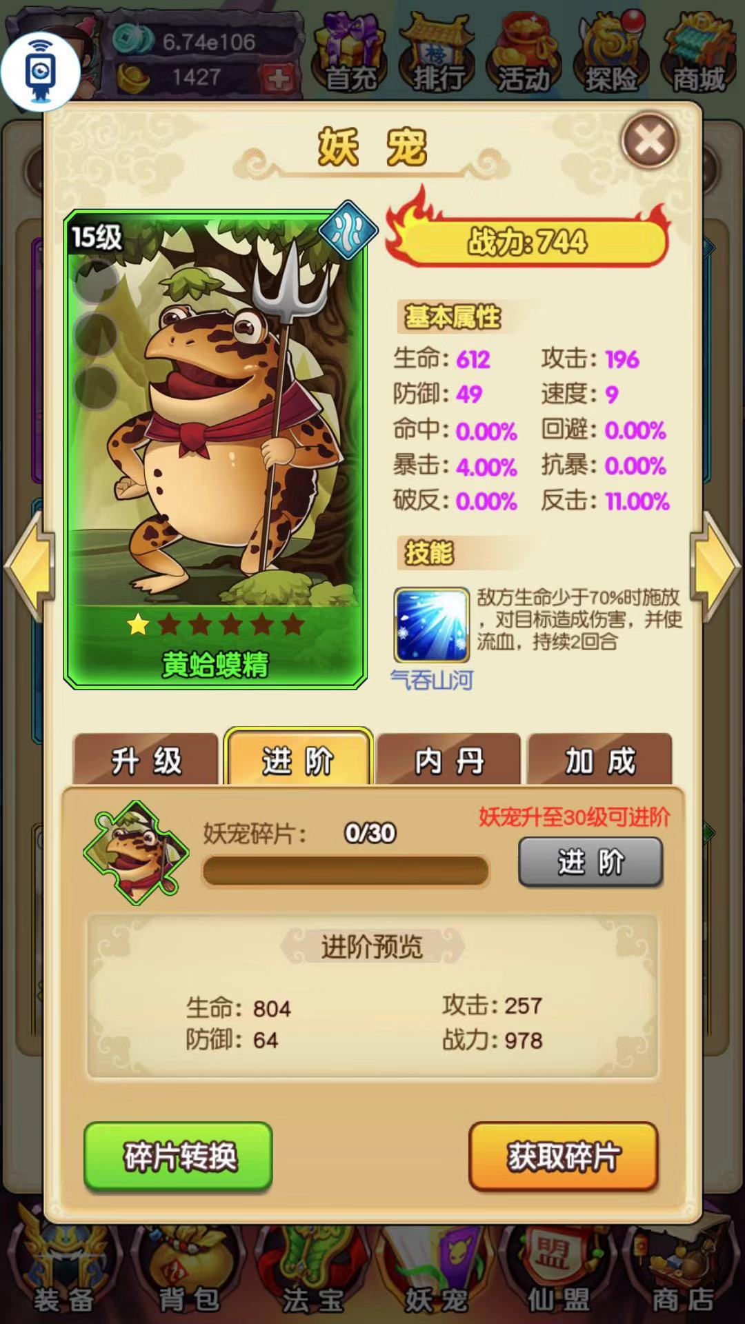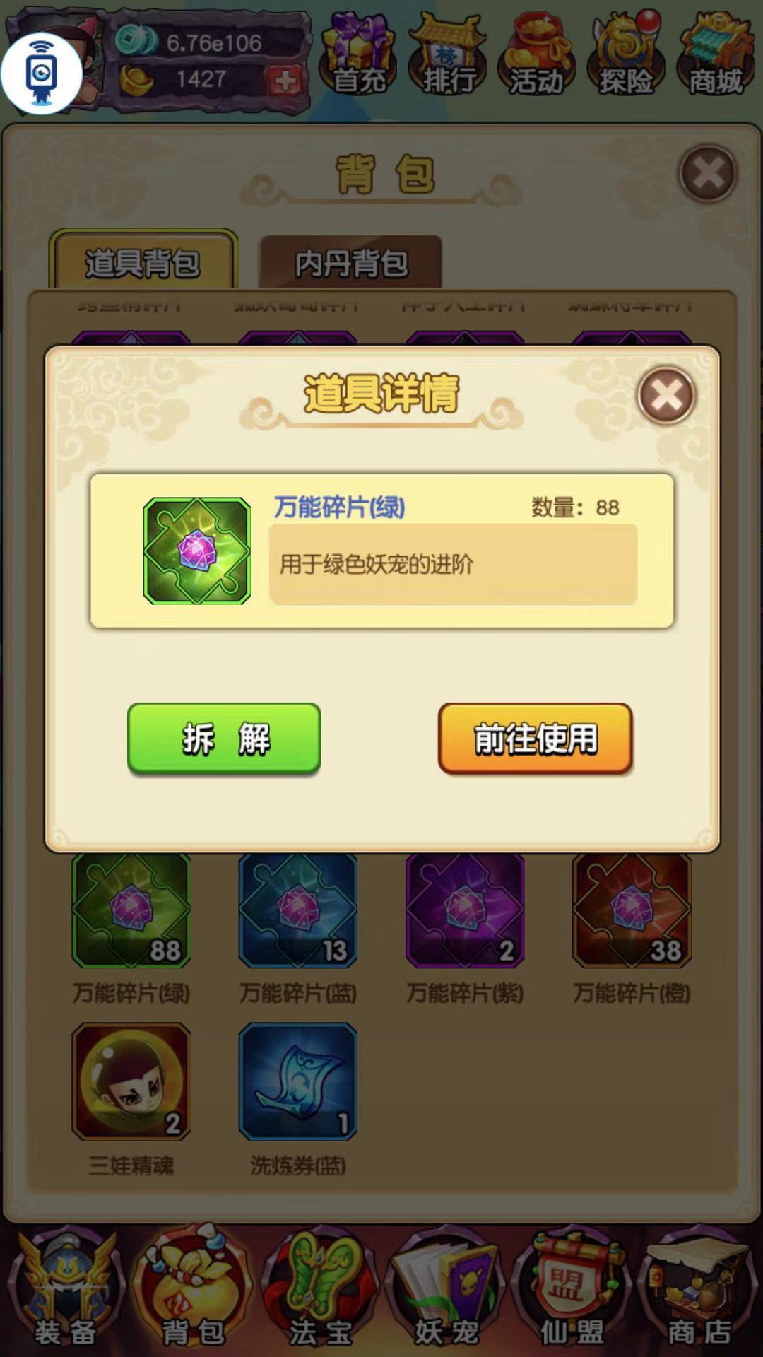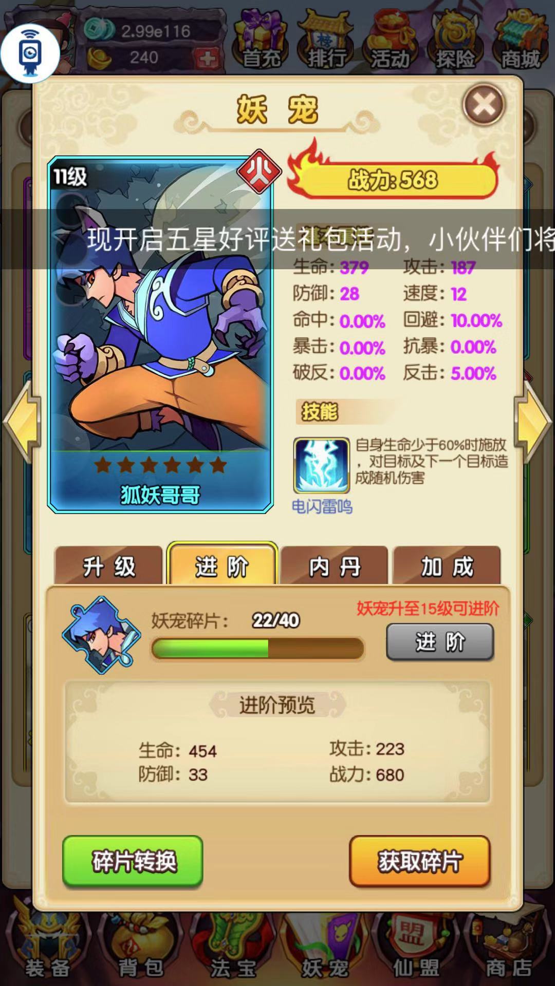 3.升星可以去打妖宠试炼的关卡,最好的方法还是前面系统赠送的很多万能碎片,这些碎片可以转换成同品质的任何一个妖宠的碎片,玩家选择自己重点培养的妖宠进行碎片转换,然后升星就好了。
