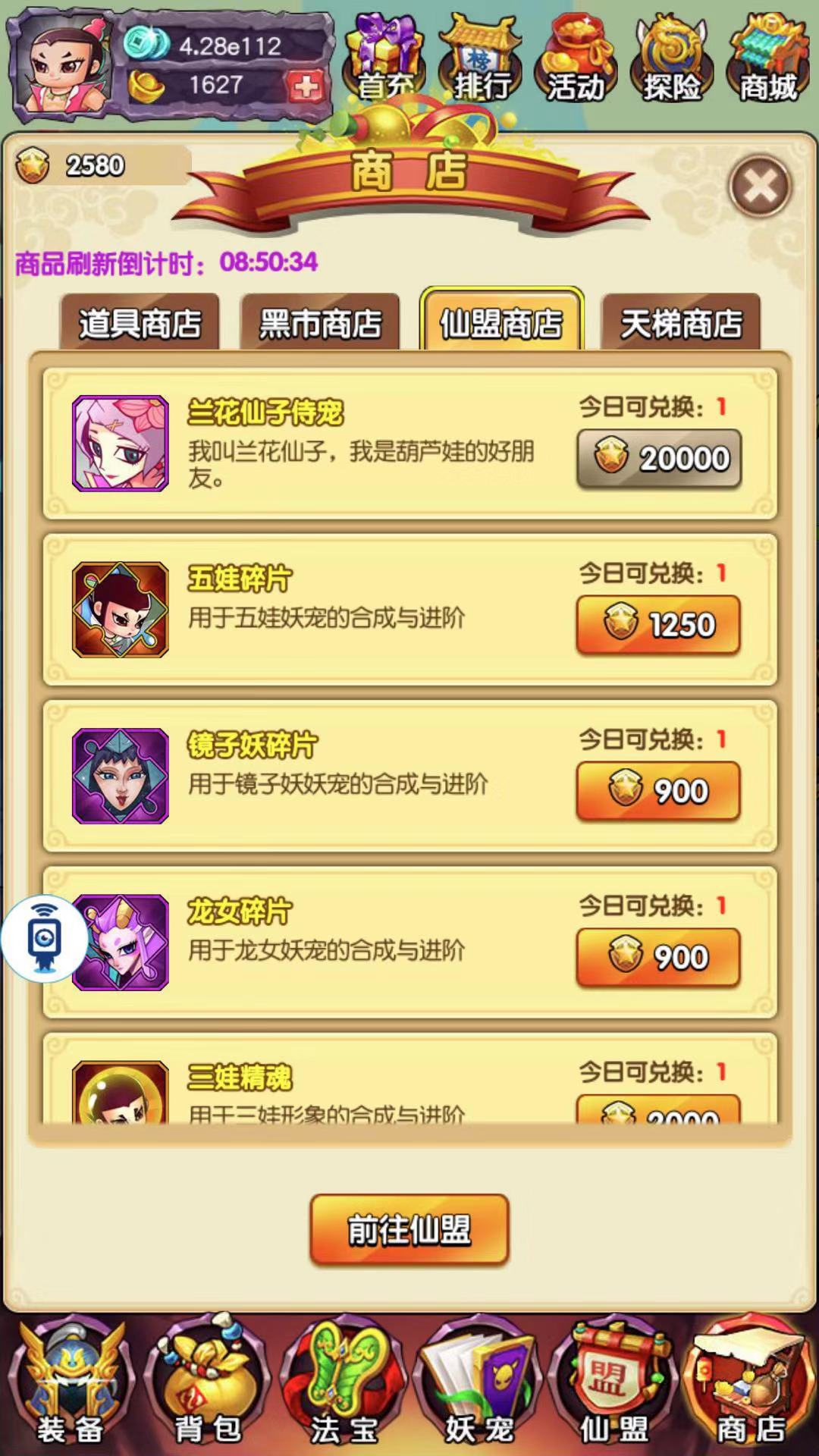 打开我们右下角的商店在仙盟商店中可以看到可以购买五娃的碎片,所以我们除了在精英试炼刷五娃碎片之外还可以在商店直接进行购买,那么给五娃升阶的可能性自然也高于其他的娃。再打开我们的天梯商店,在里面可以看到四娃的碎片,玩家一般每天都可以获得500点的征服点,那么购买一个碎片也就是2天的事情,如果玩家天梯排名还很高的话一天就可以购买一次碎片,这说明四娃也是有成长空间的。