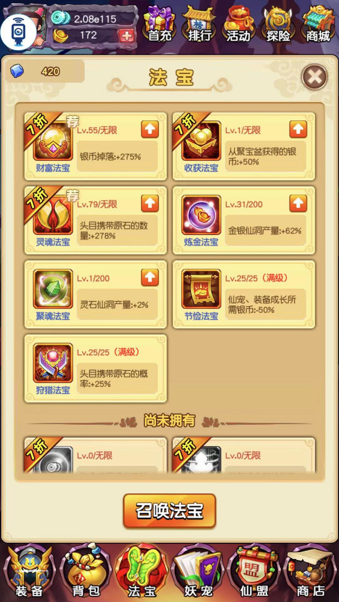 灵魂法宝:灵魂法宝是可以进行无限升级的,小编目前在1600关,每天都可以给这个法宝升级50级,意味着每天原石的获得数量都会提高百分之50。(法宝请在法宝界面购买,如果列表没有的话可以刷新几次试试)