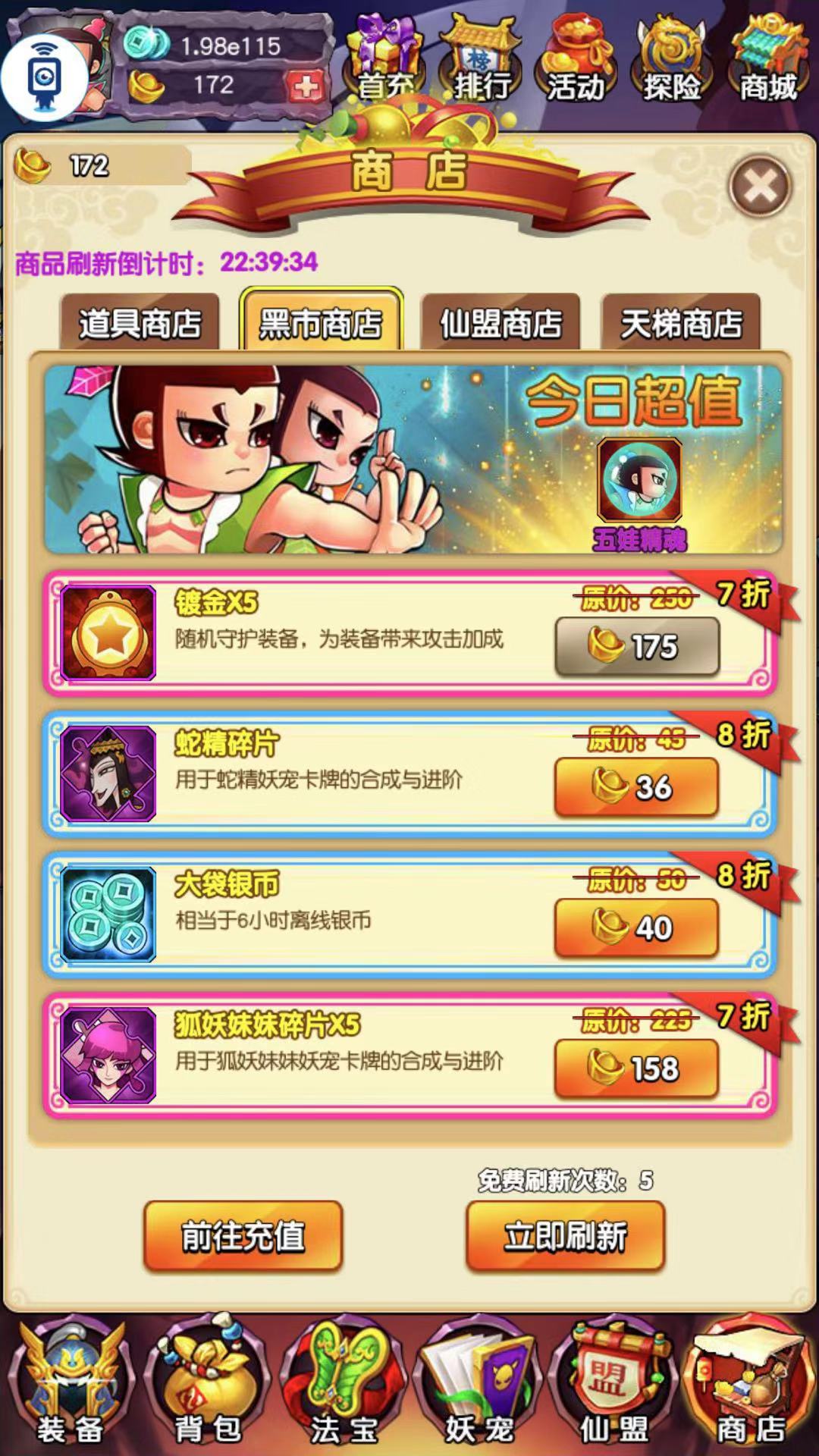 其次就是去仙盟商店、黑市商店、天梯商店购买碎片了,除了黑市商店之外,其他的都可以通过仙盟贡献点或者天梯征服点来购买妖宠碎片,虽然黑市商店需要用元宝,不过碰到打折的话花费170个元宝就可以直接买5个紫色的妖宠碎片,这种凑妖宠的方法会更加的快。