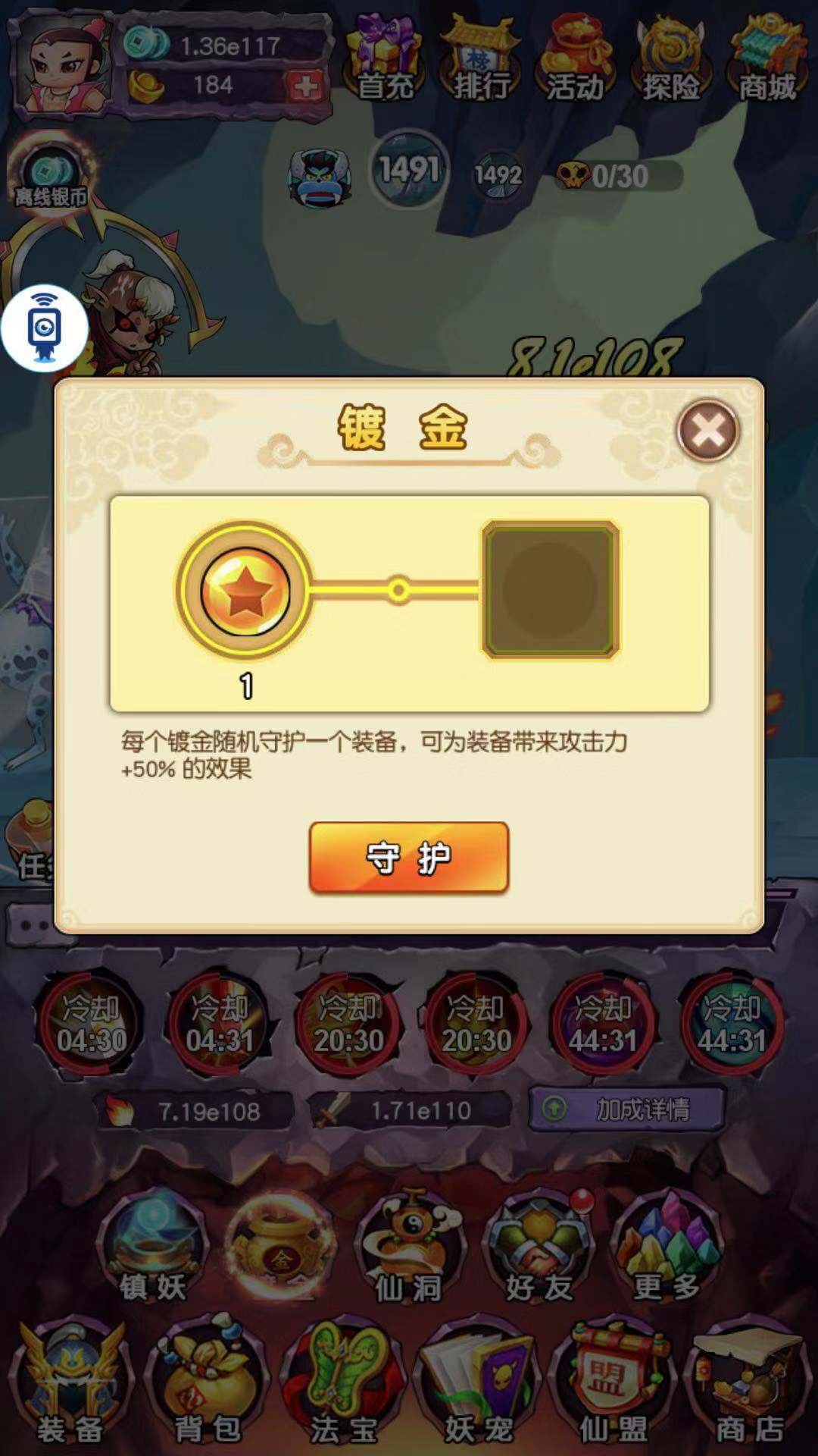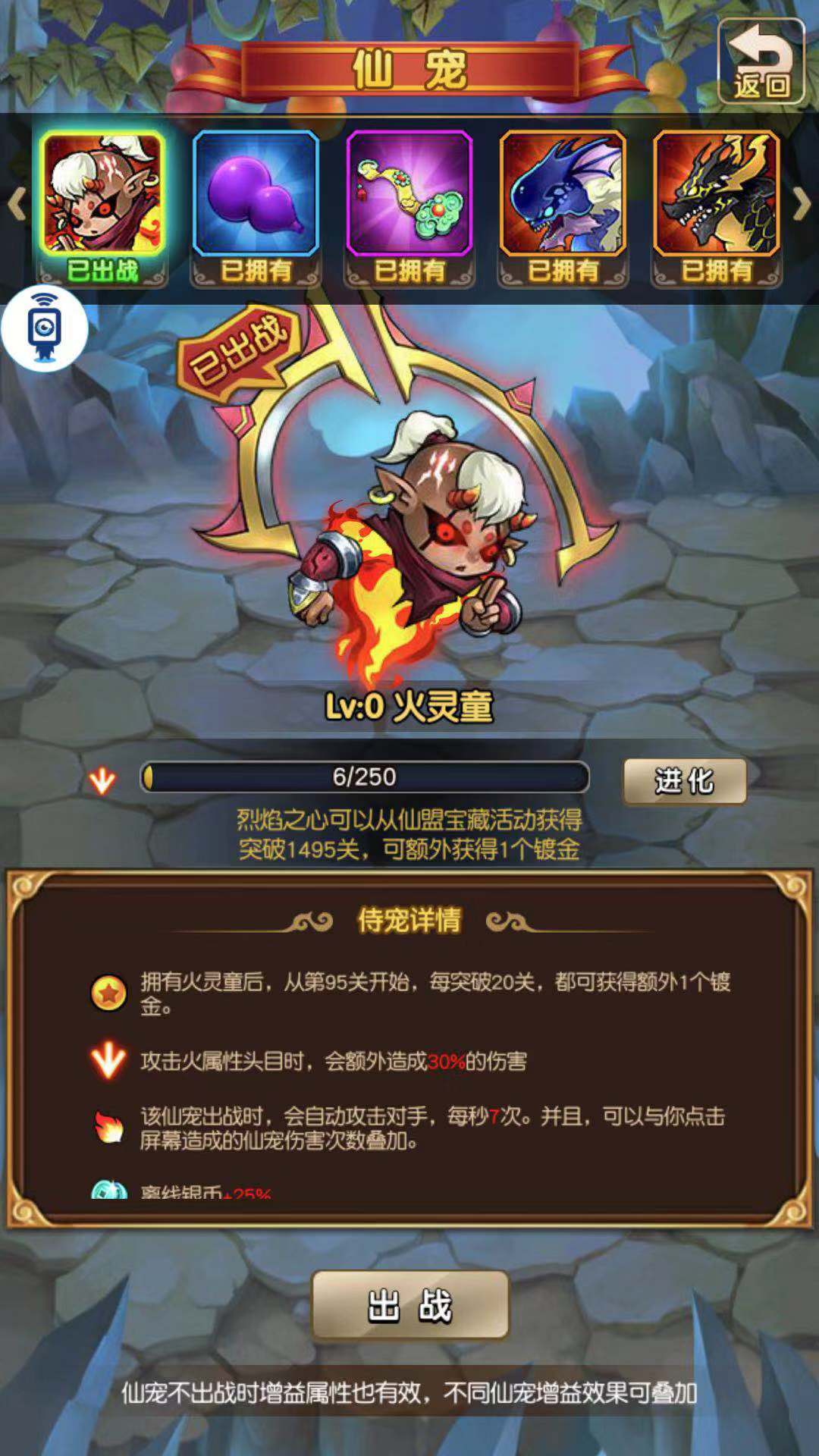 第一步:想要镀金就得有镀金球,镀金球可以通过击杀BOSS获得,也可以通过仙宠火灵童获得,火灵童每过20关就可以获得一个镀金,和水神鲲不一样,火灵童的效果是一直存在的,也就是玩家即使目前在1000关,也可以获得1000关之前的所有镀金。