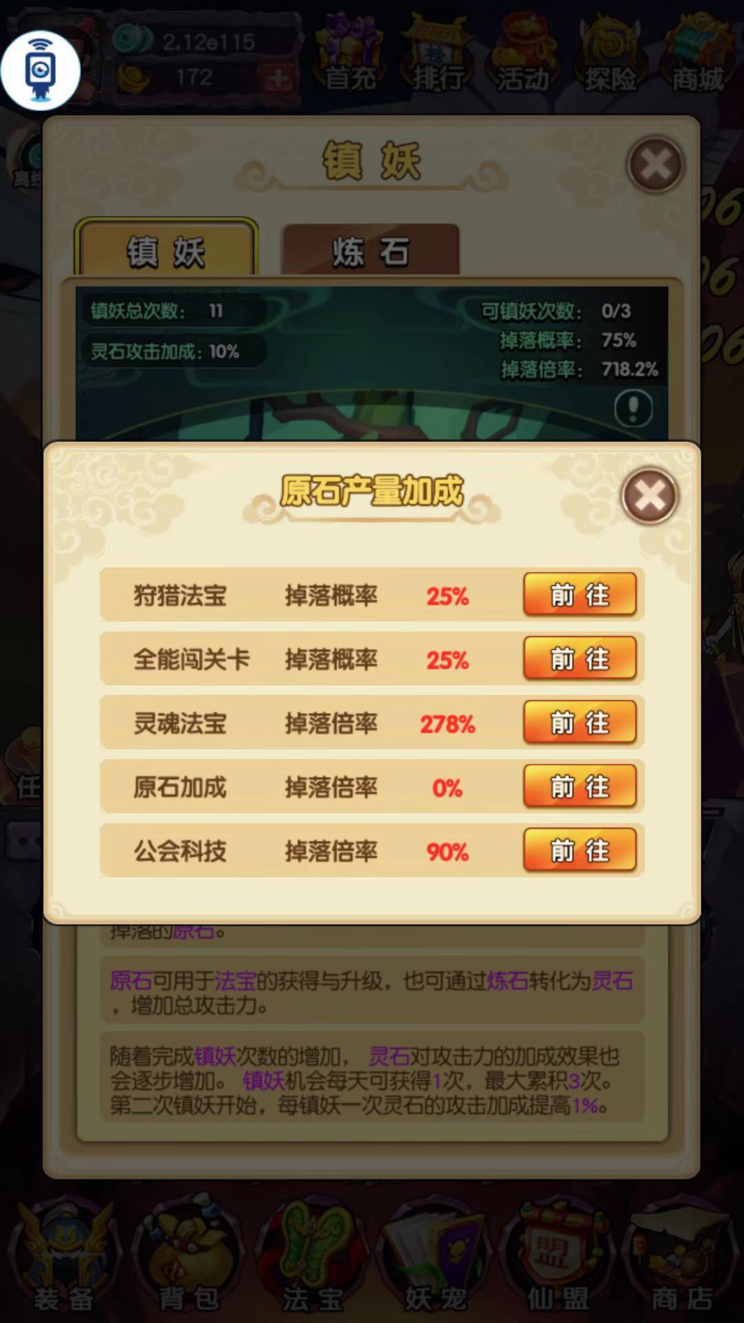 增加原石获得比例:我们点击镇妖来到镇妖界面,在这个界面的右上角有一个小小的感叹号,点击这个感叹号就可以看到原石的加成详情,这些加成是玩家突破100万原石的关键。