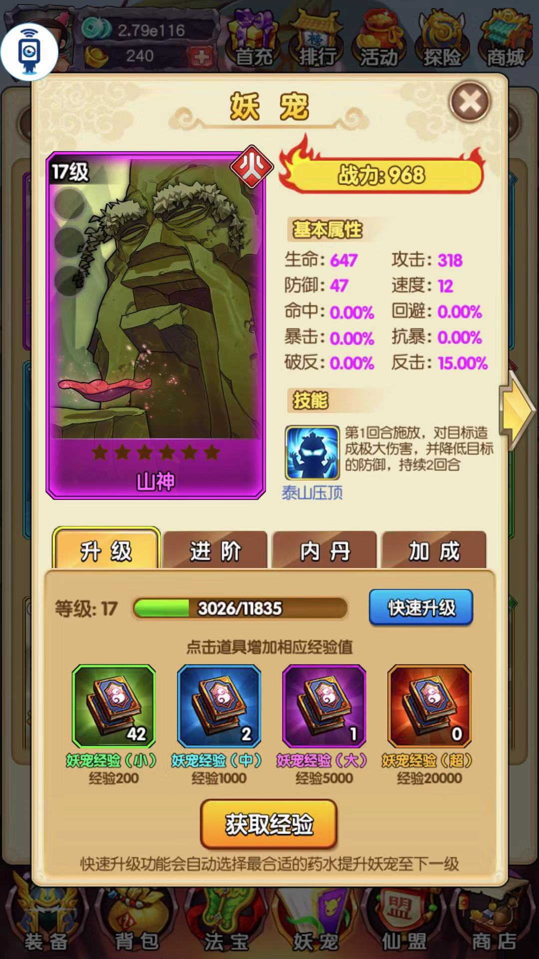 第一种:最简单的也最好理解,自然是给妖宠升级,妖宠的升级方法也多种多样,玩家使用的最多的应该就是经验书,吃本书就有大量的经验值确实很舒服。另外就是通过每天的副本也能刷个1000左右的经验值,章节打的比较靠后的玩家一天刷2000经验值也不是不可能。(经验书是单给某一妖宠使用的,而去刷宠物试炼可以给所有的妖宠提供经验)