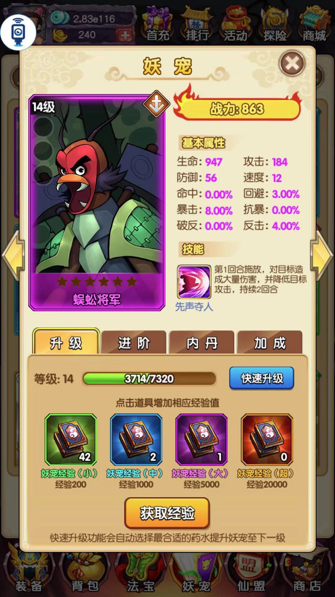 2.平民玩家组合妖宠要定向培养,先挑选好合适的妖宠,等妖宠召唤出来之后直接进行升级和升星,土豪玩家请随意。