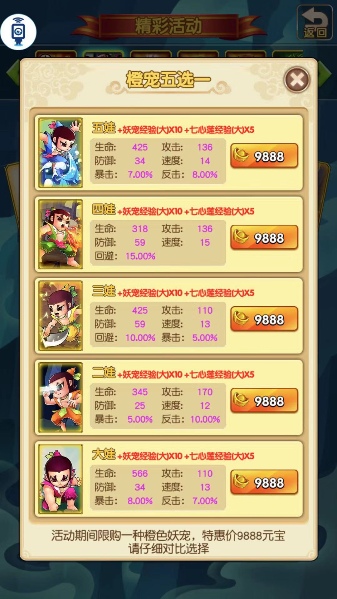 那么从一娃到五娃之间做取舍,这里面只有四娃的技能比较特殊,是攻击两个目标的,之前也说了但凡是用攻击多个目标的妖宠一定要着力培养,所以四娃一定是在培养的重点。接着值得培养的还有五娃,下面会说为什么。