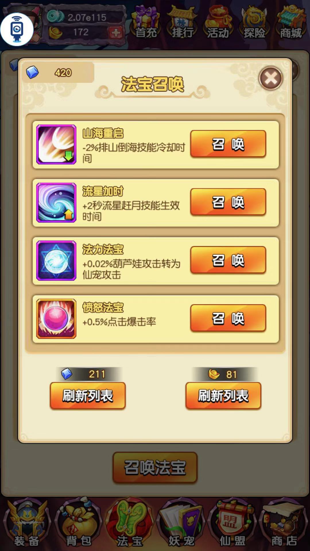 之后我们点击法宝图标来到法宝界面,点击召唤法宝就可以看到4个法宝,如果对这4个法宝并不满意的话可以点击刷新列表,只要消耗一点点原石就可以了。