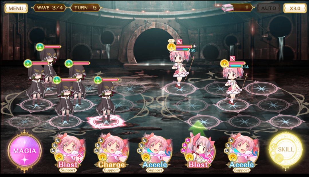 所以连携技能的存在就衍生出了中低难度副本中的"二人转"。通常的玩法是在判定puella combo的时候,连携盘会被系统判定是两个人共用的盘,除了一些特殊的情况外(X rarr;YYY)。两个魔法少女都会得到连携技能带来的攻击力加成效果。