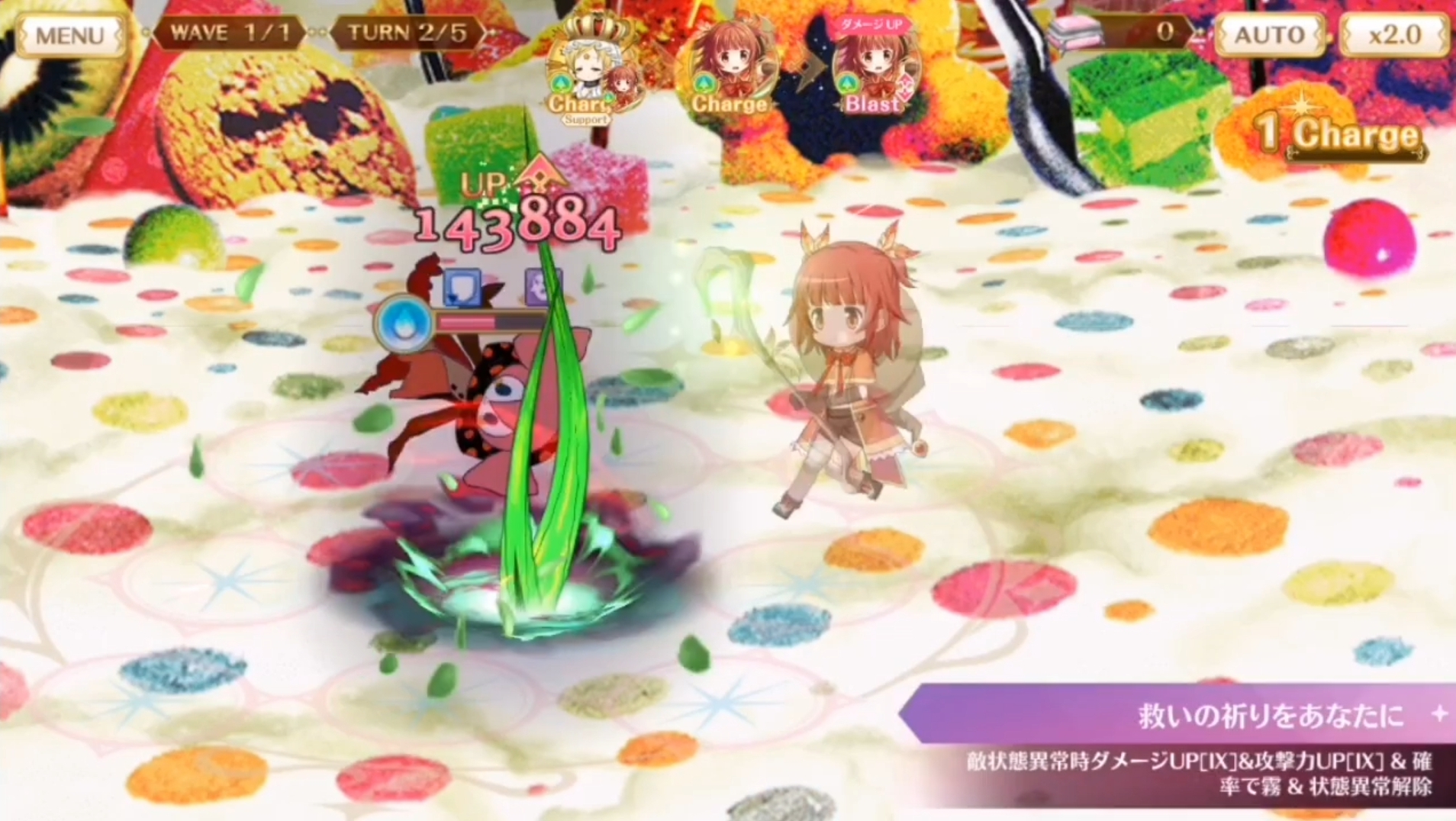 对敌方全体伤害[Ⅴ] & 防御力DOWN(敌全/3T) & Charge后伤害UP(全/3T)