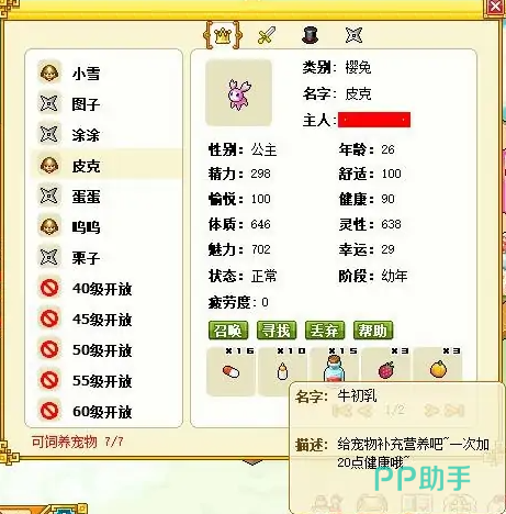但是因为之前生过病,即使是吃药好了,但是健康值还是会受到一定的影响,大家要是想要将宠物的健康值恢复到原来的满格,就需要喂养宠物牛初乳,这个道具可以将宠物的健康值恢复一些,这样整个治愈的流程就完成啦。