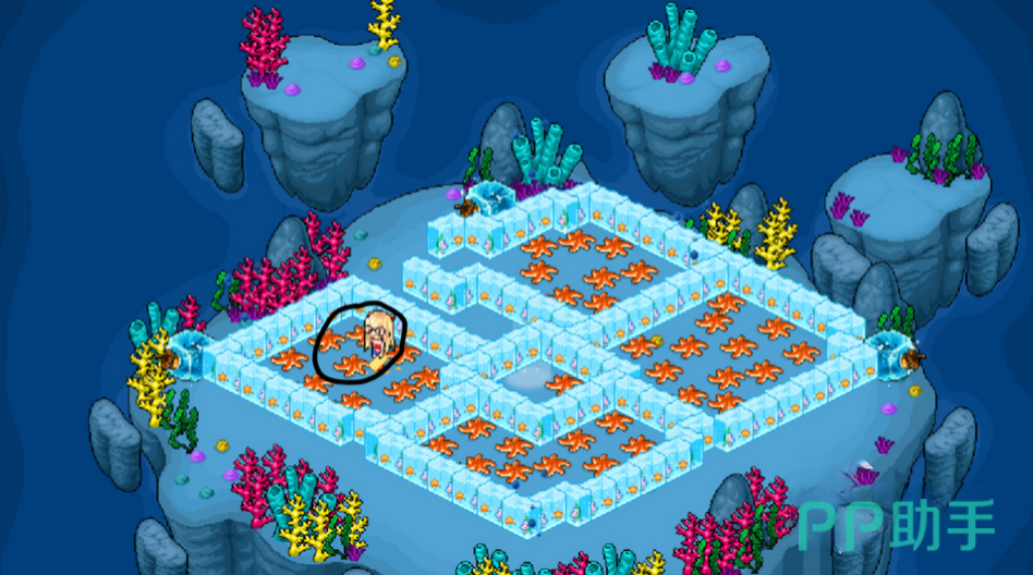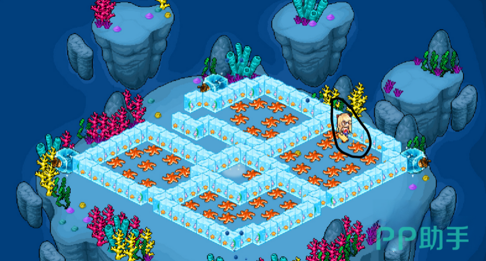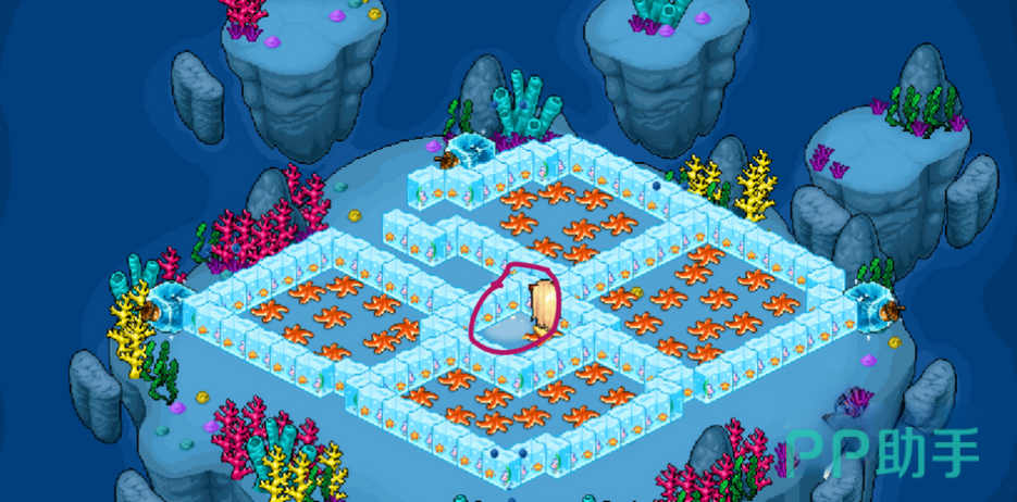 点击了之后,玩家们会发现自己还是在这个图形里面,这个时候不要着急,我们可以走到邻近右边的冰块那里,然后找到有冰块围住的,最中间的那颗海星来点击进入,这样就能够进入到下方的图形中了。在这里面,我们就需要再完成第三步,将左上角的海星点击传送。