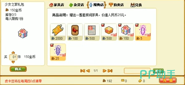 游戏中的限购商店,经常会出现这个少女之家的礼包,需要150金币,每个人还只能够买一份。我们可以在简介中看到这里面买了就会送一套家具,这个家具的价值在25元这样,因此也吸引了很多玩家的购买,玩家们会看到周围都是这套家具的装饰。