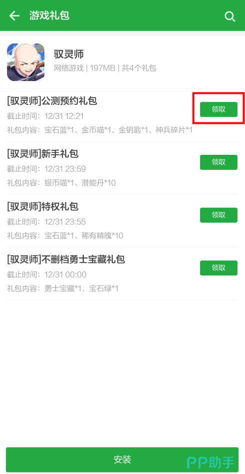 豌豆荚现正派送的游戏礼包有公测预约礼包、新手礼包、特权礼包等等,更多礼包可以在驭灵师礼包专区中领取。