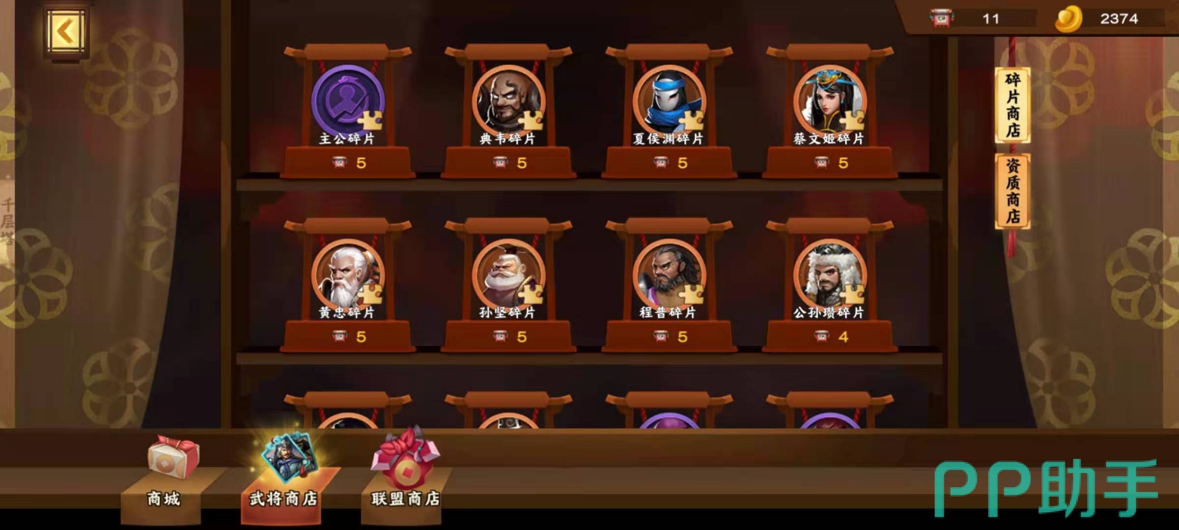 橙色碎片获得方式除了上面说的招募获得外,副本闯关,大地图击杀武将,武将商店购买等也能获得碎片,副本中每个指定的关卡都会掉落特定的武将碎片,在大地图上,随机分布着一些橙色武将怪物,玩家可以前去讨伐这些怪物,战胜之后就有几率获得该武将的碎片箱子,如果不在大地图上找可以在演武场去挑战,效果是一样的,武将商店中可以通过魂石来兑换武将碎片,魂石可以通过游戏中的日常活动获得。