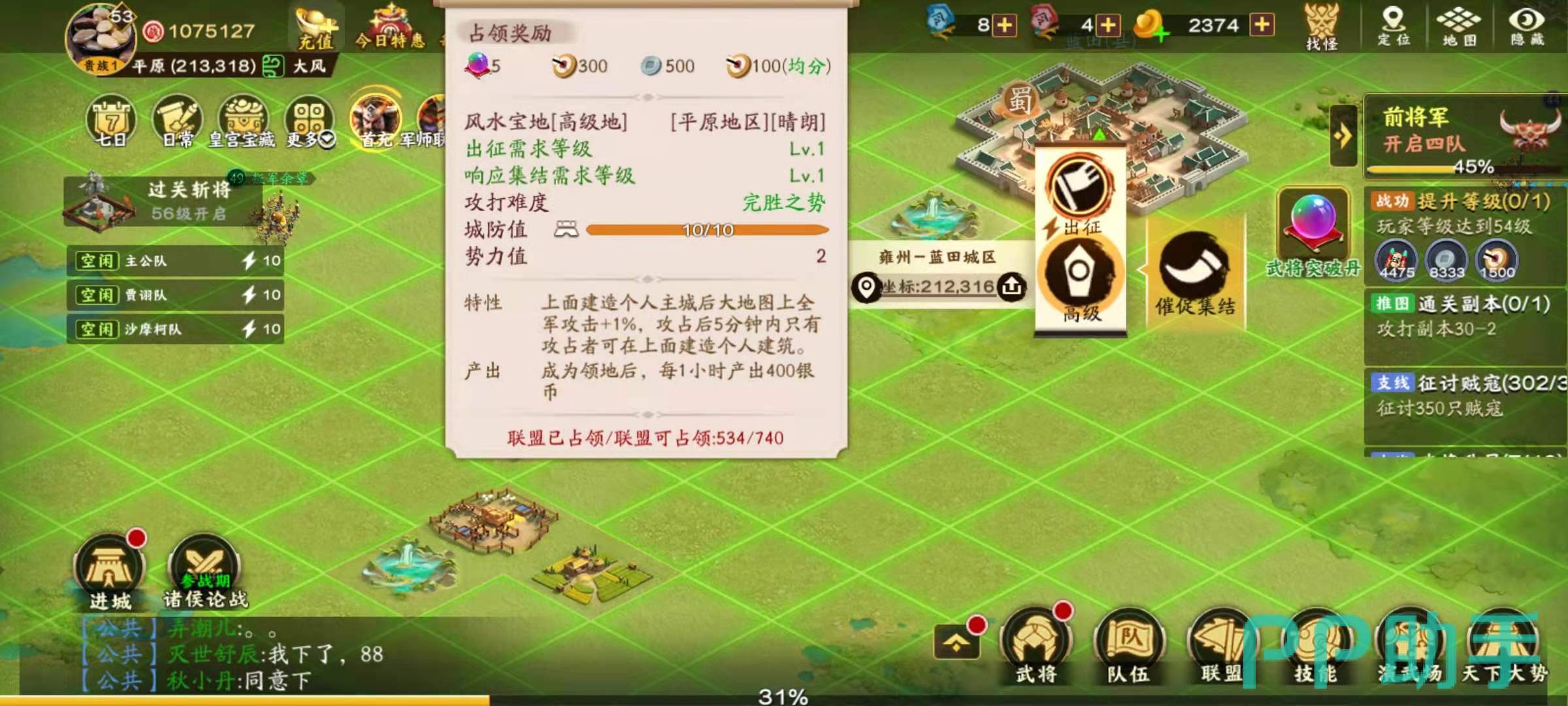 高级土地包括农田,民卫,牧场,村落,其中村落的特殊作用是占领之后可以获得蓝田玉的产出,每块村落每六个小时可以获得8枚蓝田玉的奖励,如果是占领十块村落土地的话, 每天就可以获得320枚蓝田玉,还是很不错的。牧场的特殊作用是占领后可以产出马场玉,每块牧场,每6个小时可以得到2个马场升级玉。