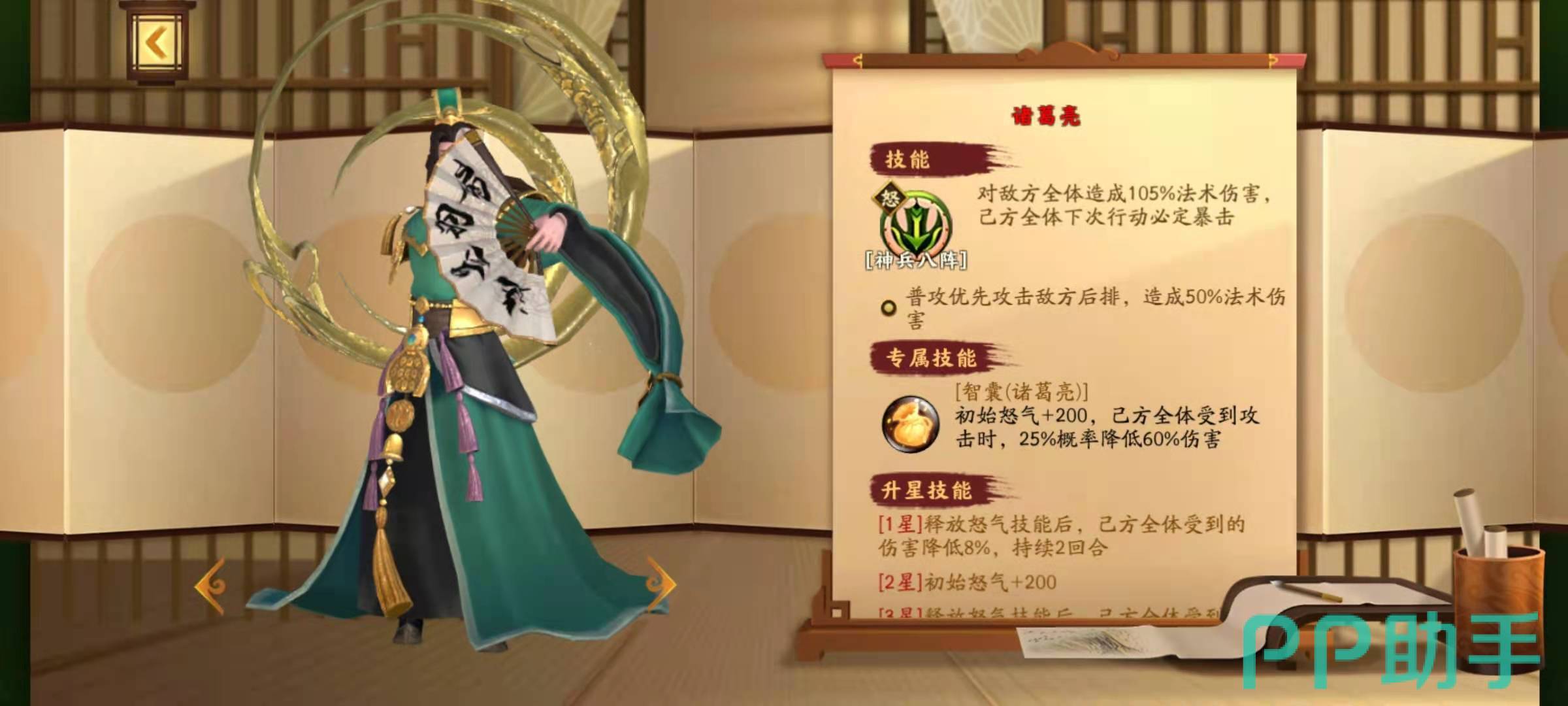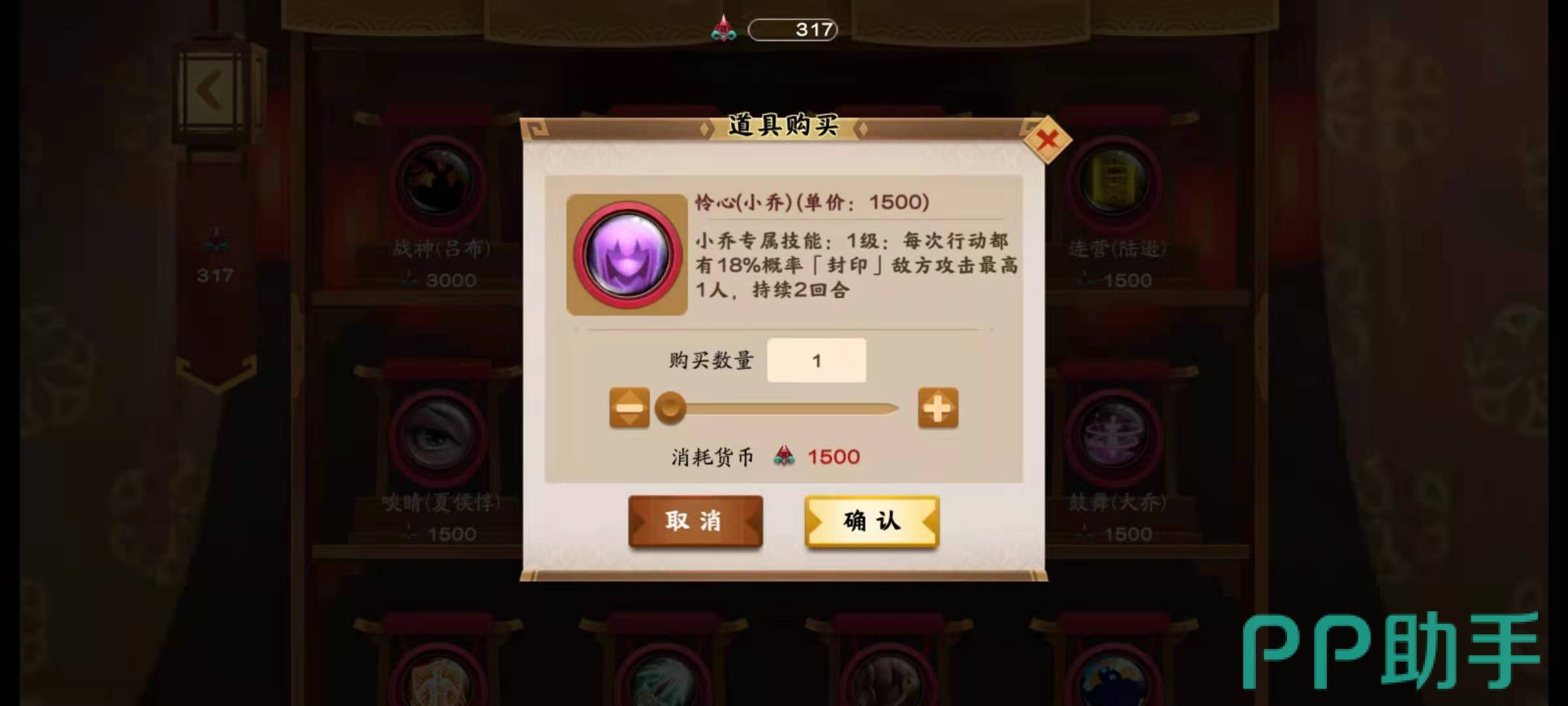 小乔的秘籍是怜心,效果是可以在小乔每次出手之后,都有几率为敌方攻击力最高的一名武将附加封印效果。这个技能使得小乔成为非常针对敌方输出核心的武将,尤其是面对吕布,周瑜这样的暴力输出时尤其有用。小乔在升星之后效果也是非常好,升到了2星之后,敌方被封印的武将造成的伤害还能进一步降低。