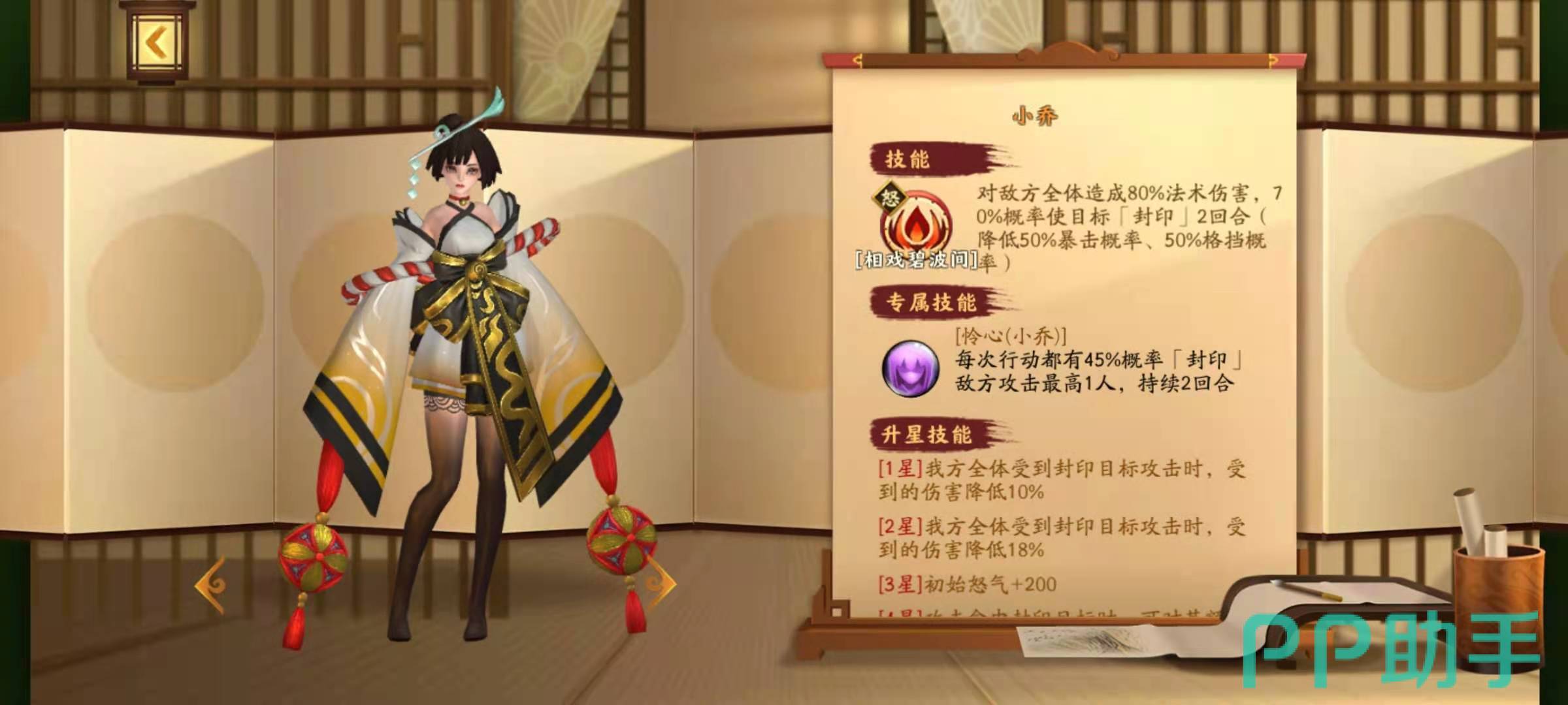 升到了5星的时候,小乔攻击被封印的目标时候,可以造成额外的伤害,自身受到封印目标攻击时,可以额外恢复怒气。总是小乔的一起都是以封印为核心的,所以在搭配阵容的时候非常广泛,既可以搭配其他具有控制技能的武将来组成控制流,也可以和暴力输出武将组成控杀流。