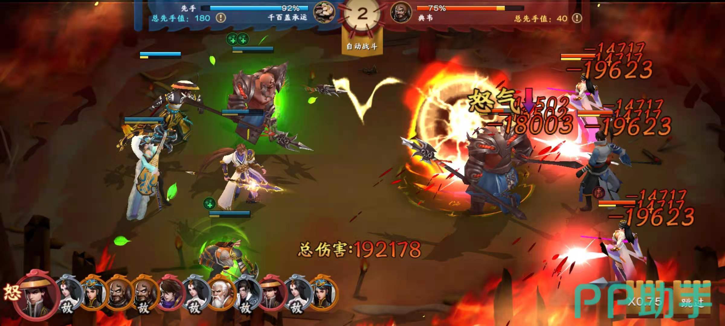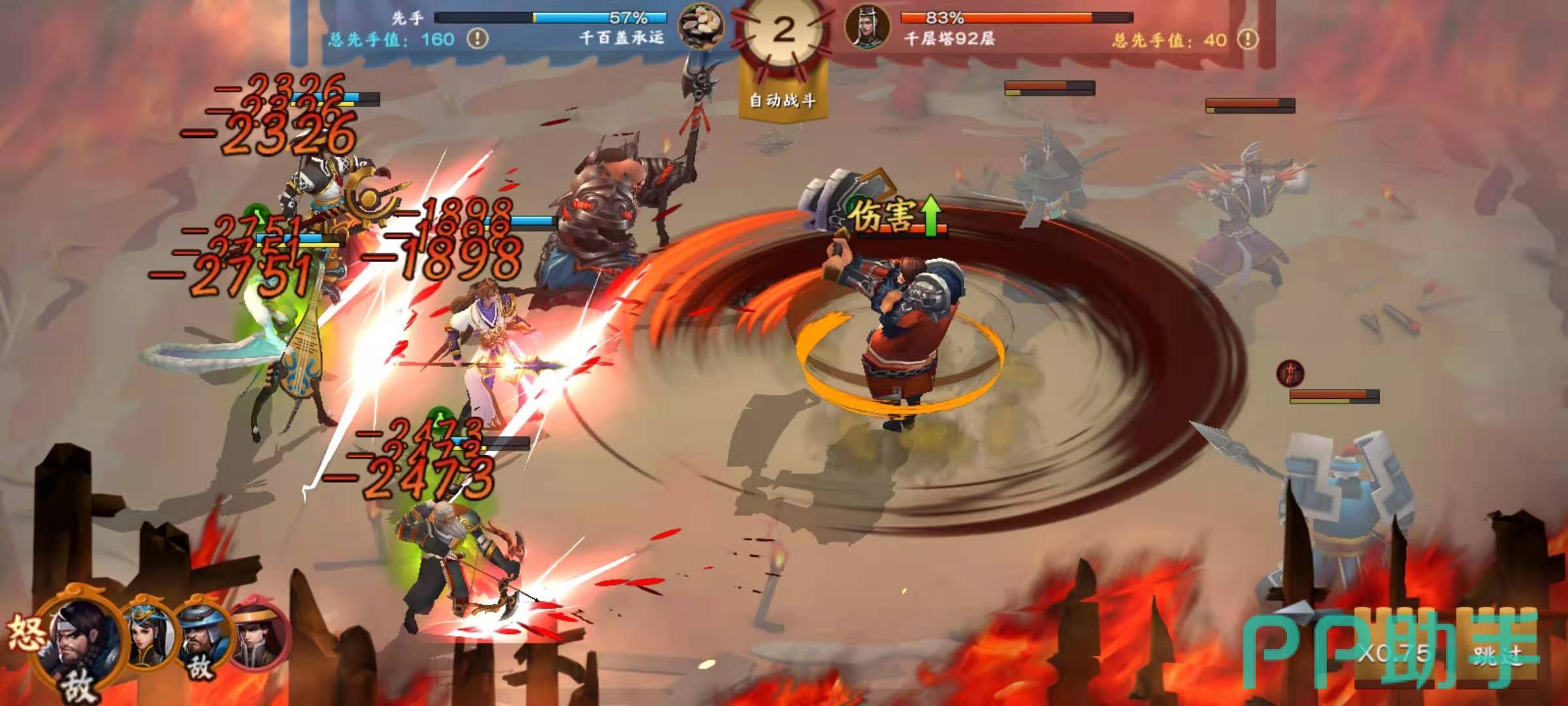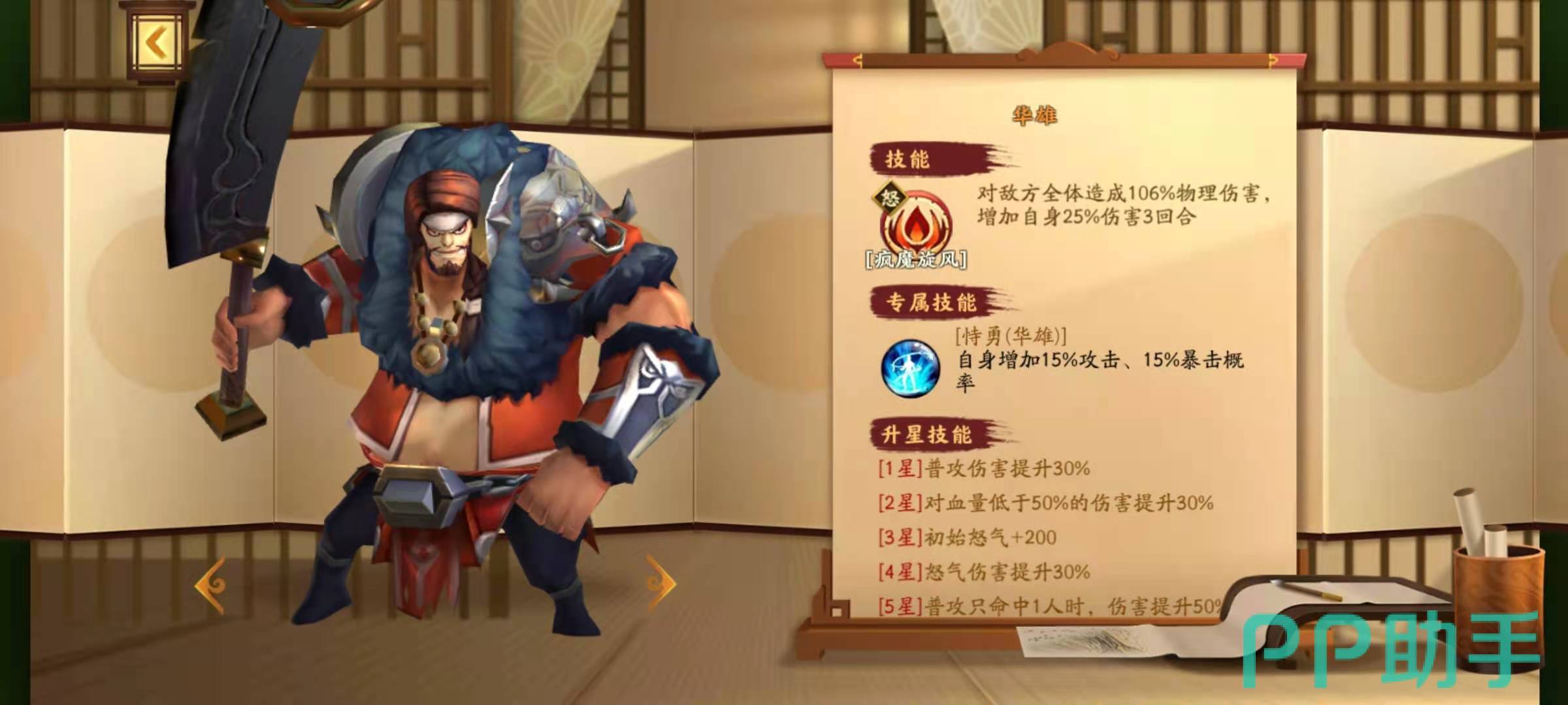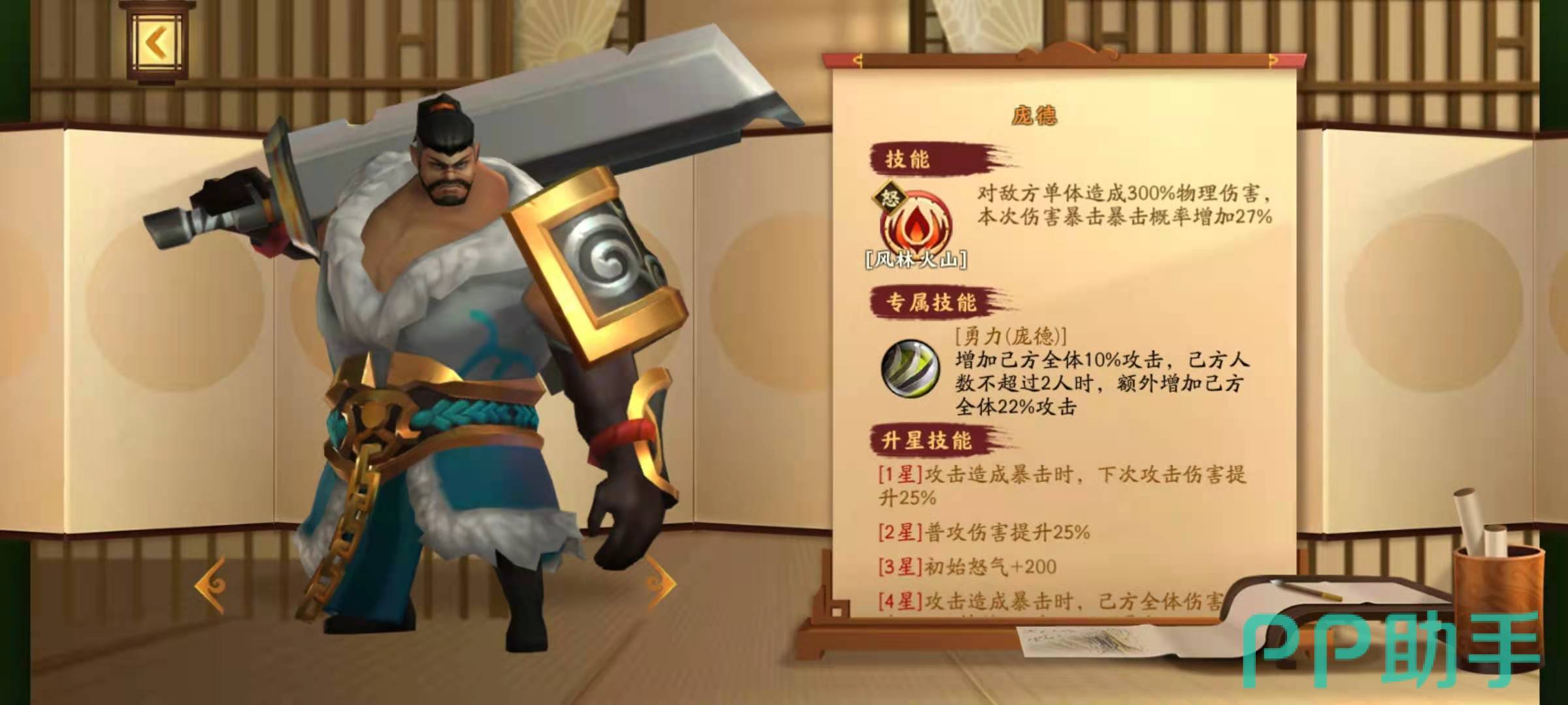 华雄的核心技能是大招封魔旋风和专属技能持勇,持勇可以增加自身的攻击力和暴击概率,大招封魔旋风是全体伤害技能,有了暴击伤害的加持,可以打出高额的伤害。庞德的核心技能是大招风火山林,效果是造成敌方单体伤害,并且本次伤害的暴击概率增加27%,这个技能本身伤害就不俗,再加上暴击加成,更是可以直接秒人。