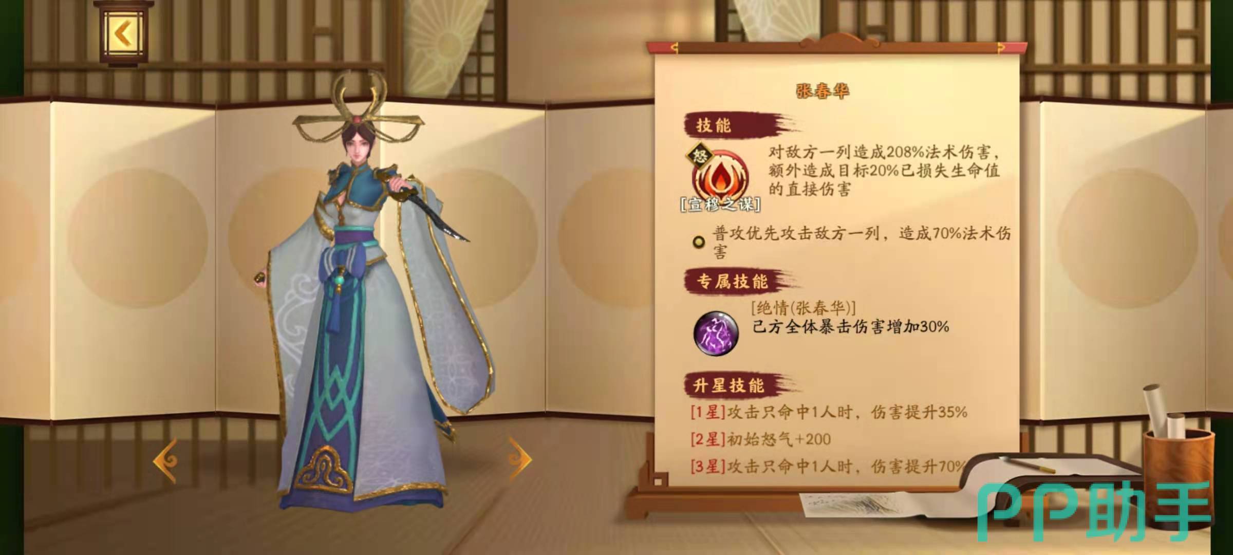 反间的效果是我方全体武将造成的伤害提高10%,周瑜自身的暴击伤害提高50%,这些都是可以算在暴击里面的。诸葛亮的核心技能是神兵八阵,效果是在大招使用之后,己方全体武将下一次攻击必定会出现暴击,这个技能如果能搭配着大家的大招使用的话,效果非常恐怖。张春华的核心技能是专属技能绝情,效果是己方全体武将的暴击伤害提高30%,这也是可以和周瑜的加成叠加在一起的。