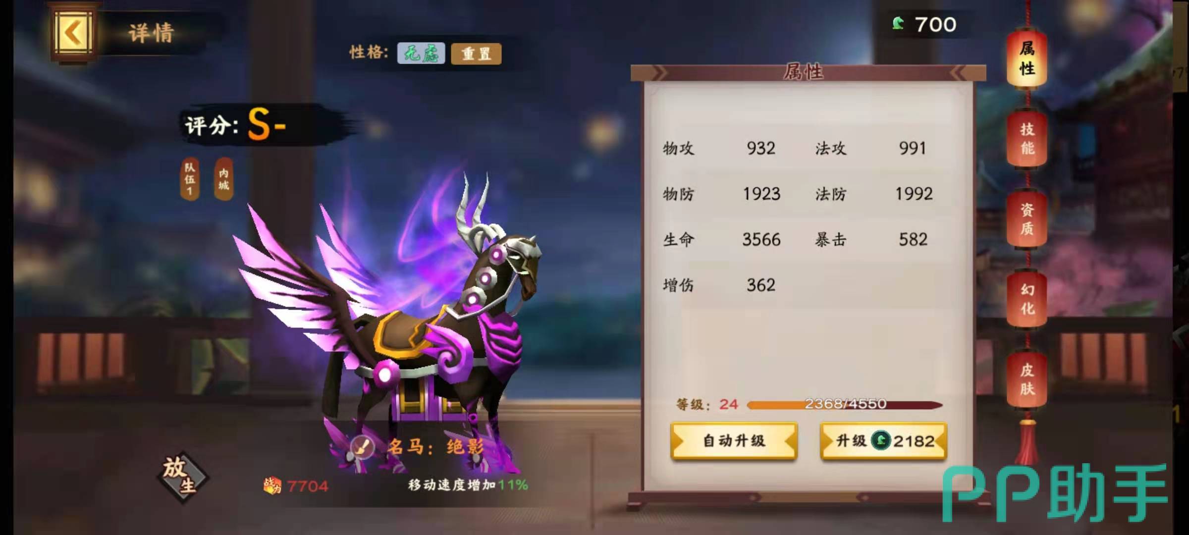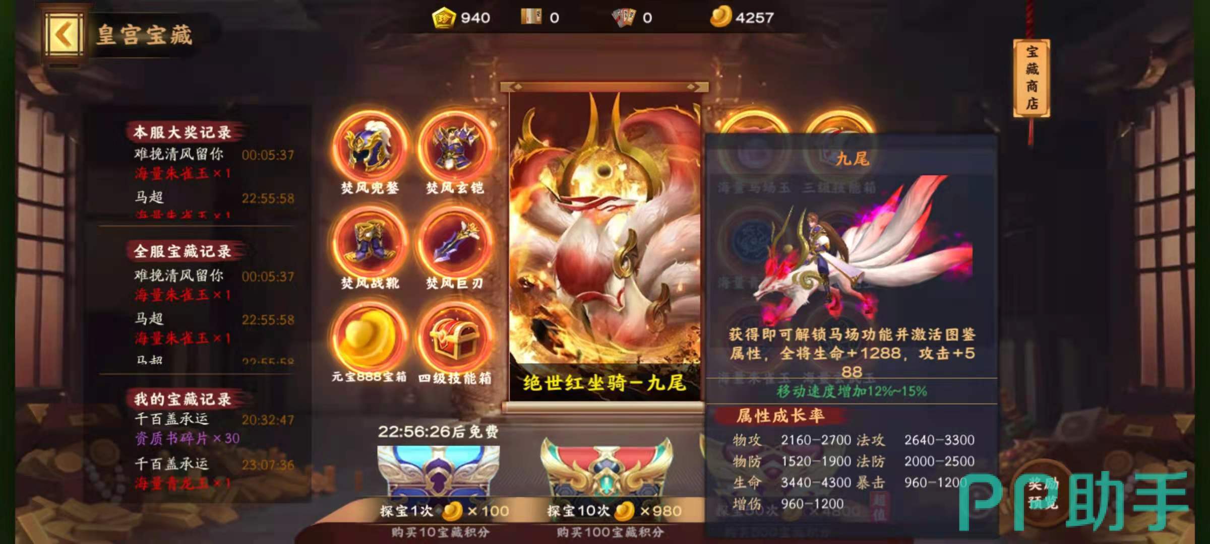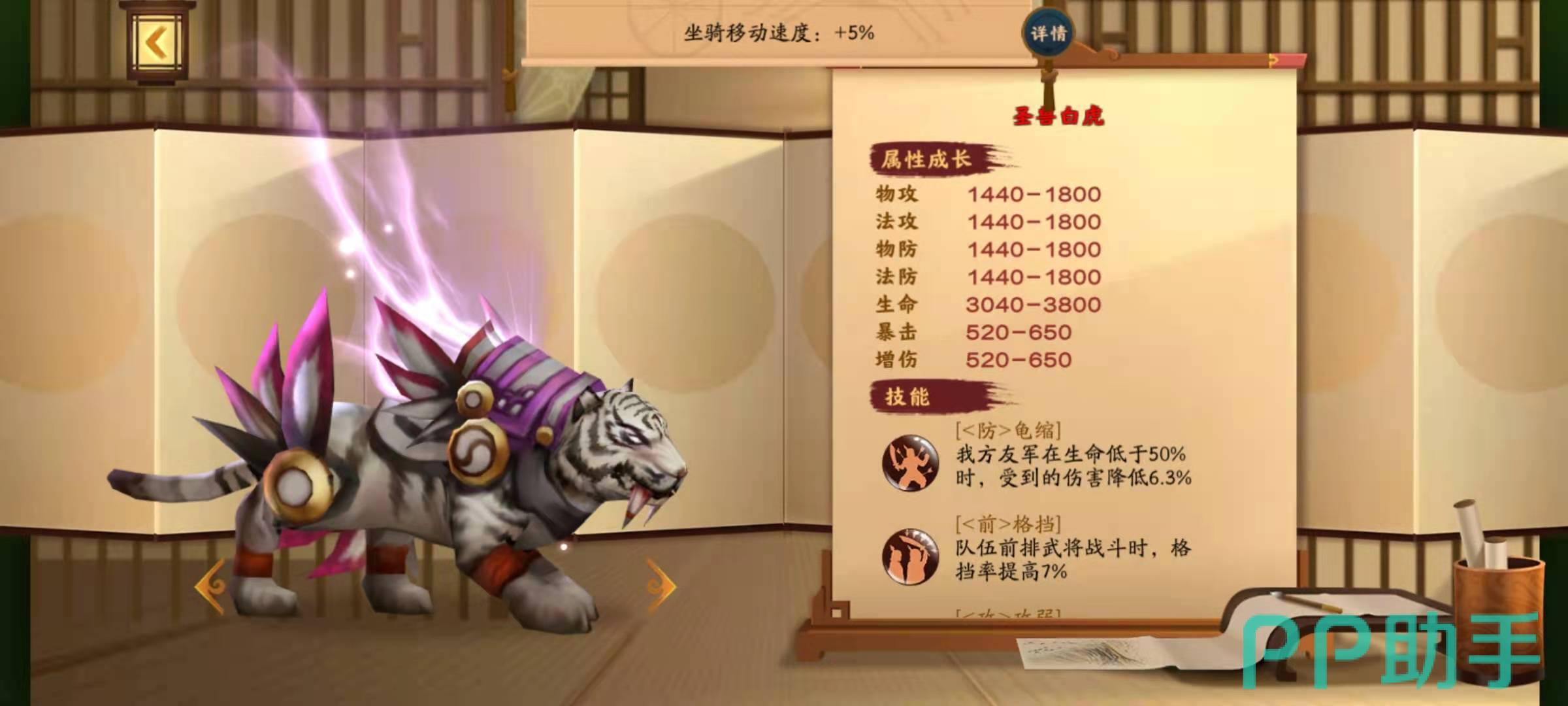 先来说一下九尾,九尾是当前最热门的神兽,目前通过活动皇宫宝藏抽奖就可以得到积分,再使用积分就能兑换到神兽九尾了。九尾的特点是攻击资质非常好,物攻属性成长是2160-2700,法术攻击成长是2640-3300,对于攻击型武将来说,九尾可以增加攻击性武将在血量高于半血石的伤害值,增加攻击性武将的攻击力,对于后排武将,增加低法术防御的穿透力,以及攻击性武将的血量。