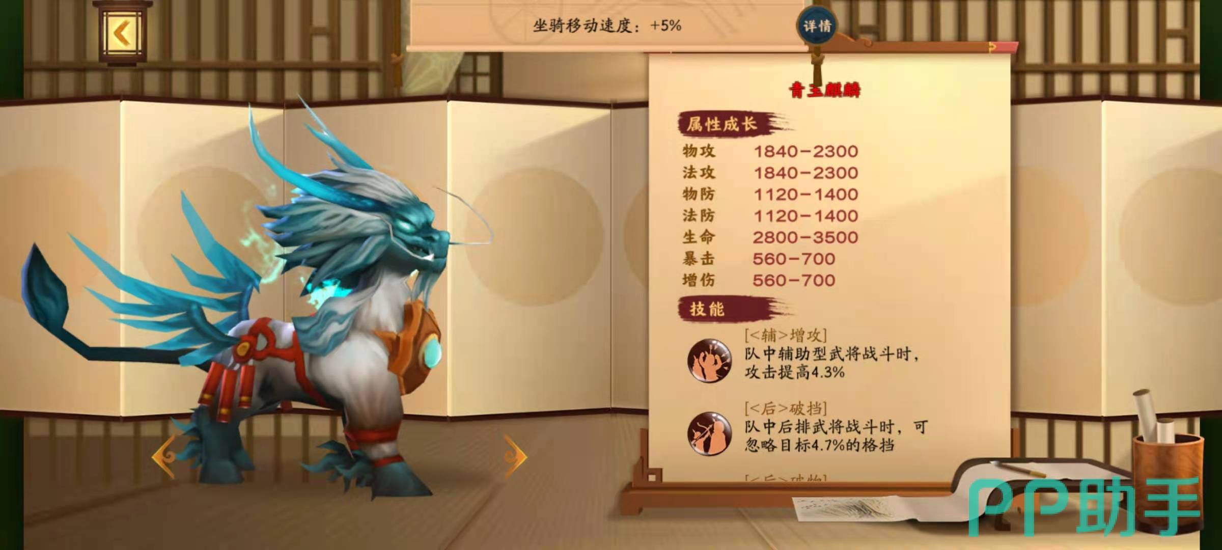 青玉麒麟的特点是属性都很均衡,技能增攻,效果是增加辅助武将的攻击力;技能破挡,效果是忽略对方武将的格挡值;技能破物,效果是使得后排武将攻击时忽略敌方的防御力;技能坚韧,可以降低己方武将被暴击的几率;技能攻弱,效果是增加攻击性武将的10%的暴击伤害。